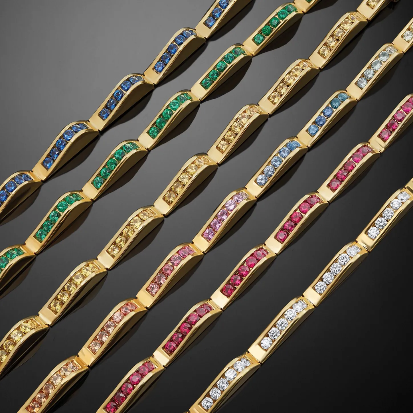 18K Gold And Blue Sapphire Gemstones Form This Couture Link Wave Bracelet.