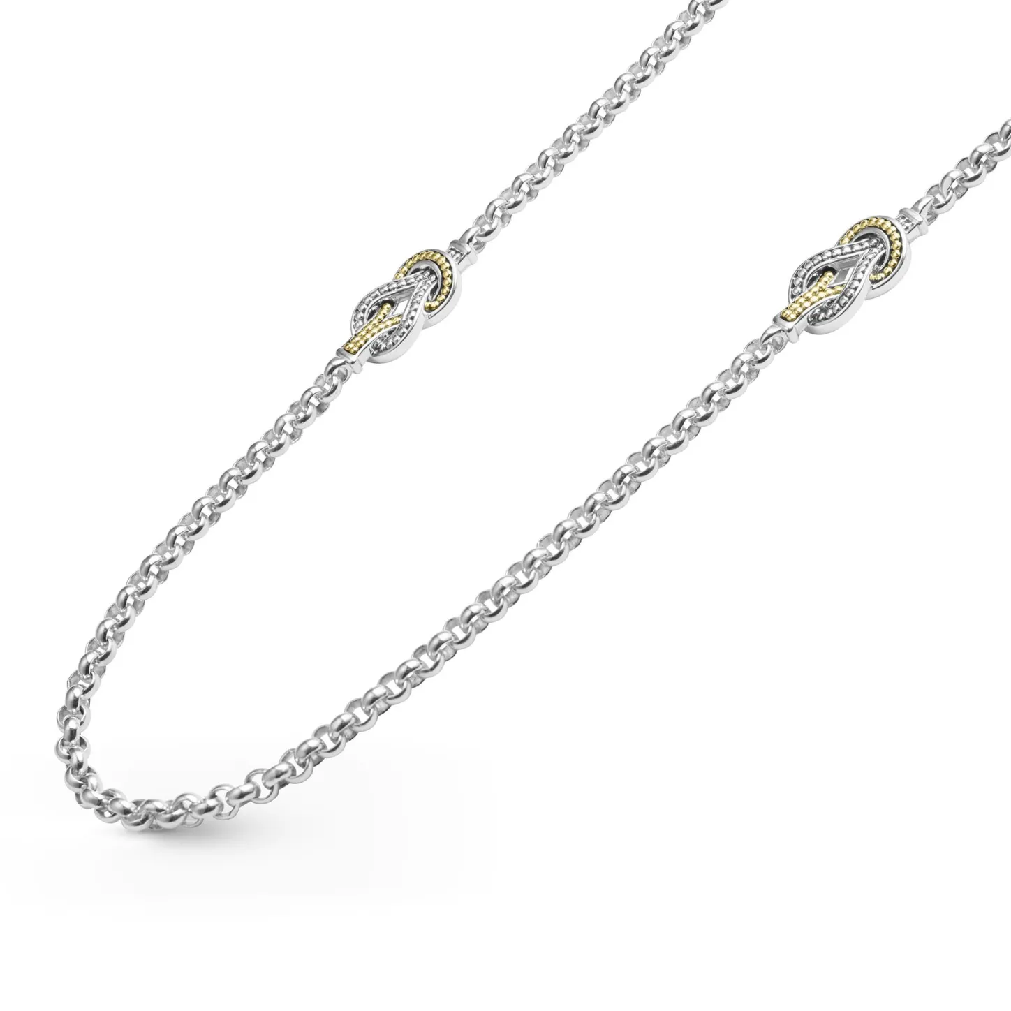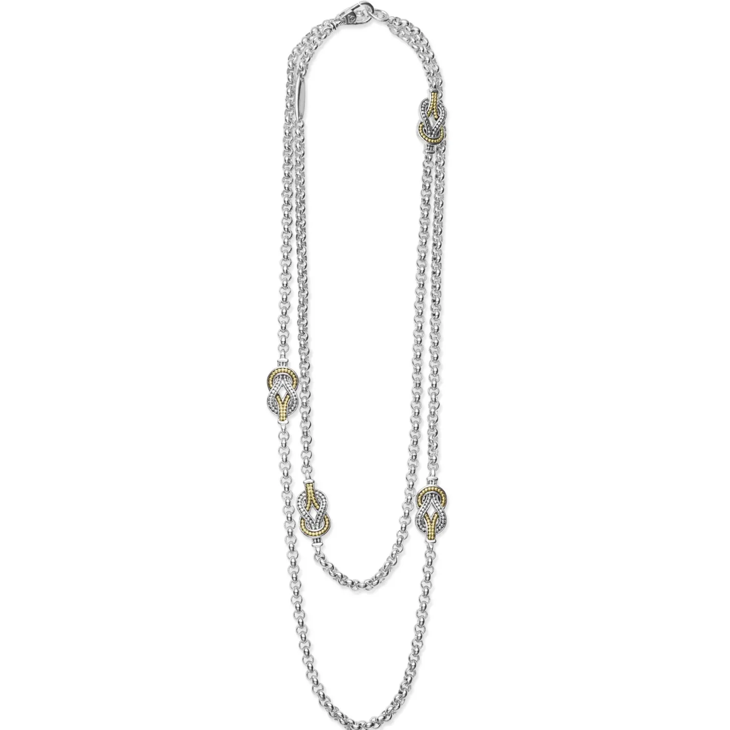 Four Sterling Silver And 18K Gold Knot Motifs Accent This 34 Inch Sterling Silver Chain Necklace.