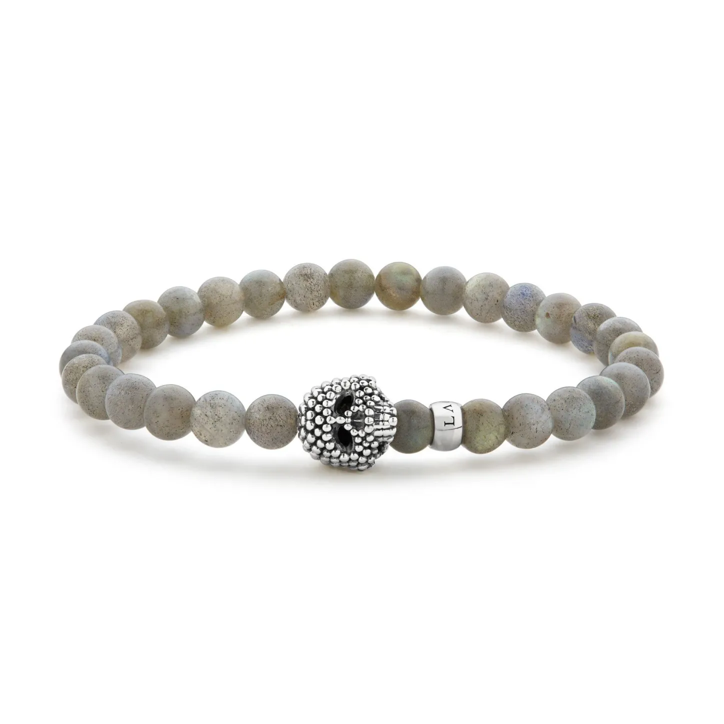 Labradorite Gemstone Beaded Bracelet With A Sterling Silver Caviar Skull.