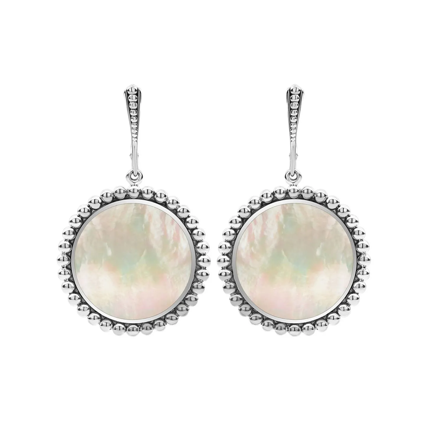 Mother Of Pearl Gemstone Circle Drop Earrings Surrounded By Sterling Silver Caviar Beading.