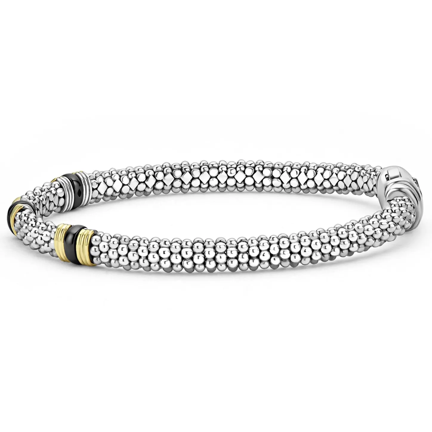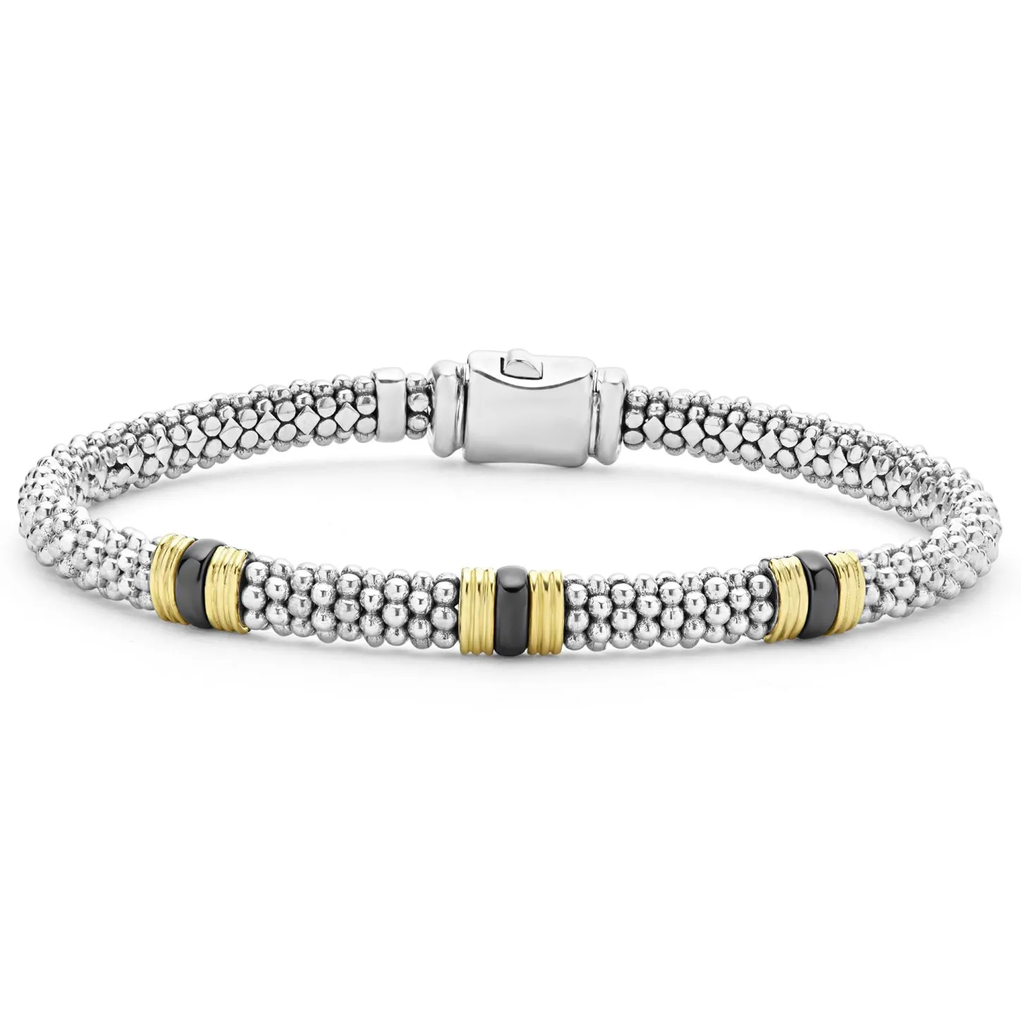 Three 18K Gold And Black Ceramic Stations With Sterling Silver Caviar Beading Form This Signature Bracelet.