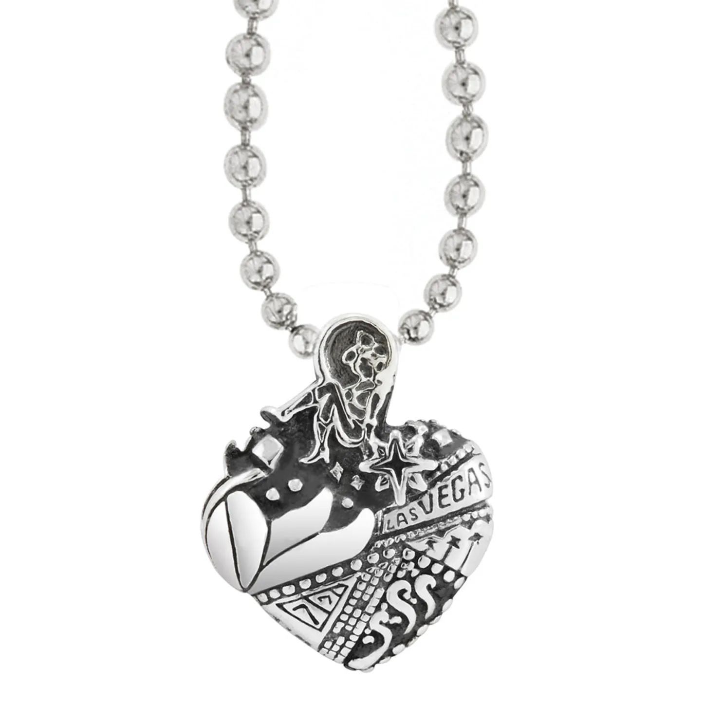 A Sterling Silver Heart Pendant Which Showcases Architectural And Cultural Icons Of Las Vegas Finished On A Ball Chain Necklace.
