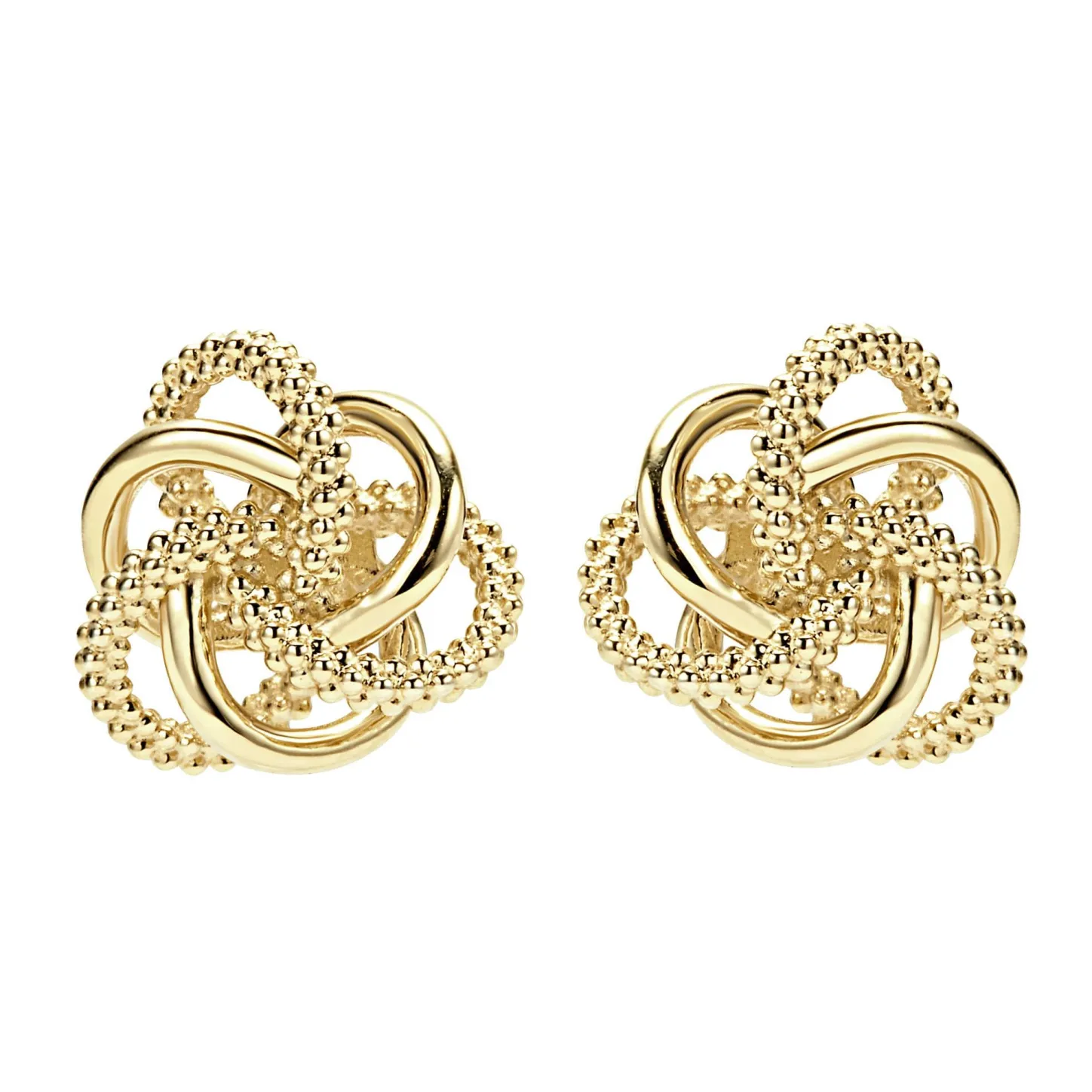 Love Knot Stud Earrings Formed Of Caviar Beaded And Highly Polished 18K Gold Bands.