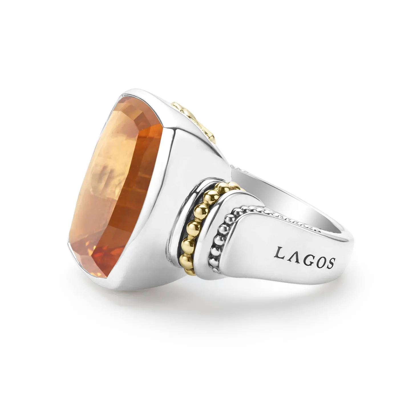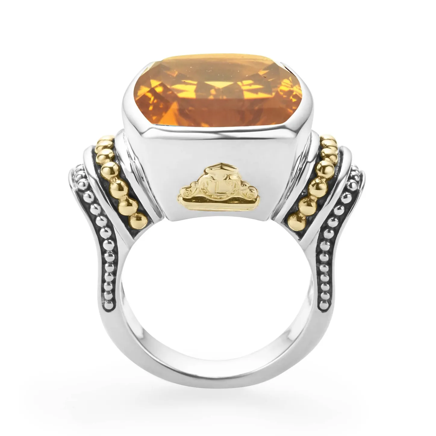 Citrine Bezel-Set Gemstone Statement Ring With 18K Caviar Beading On A Sterling Silver Band.