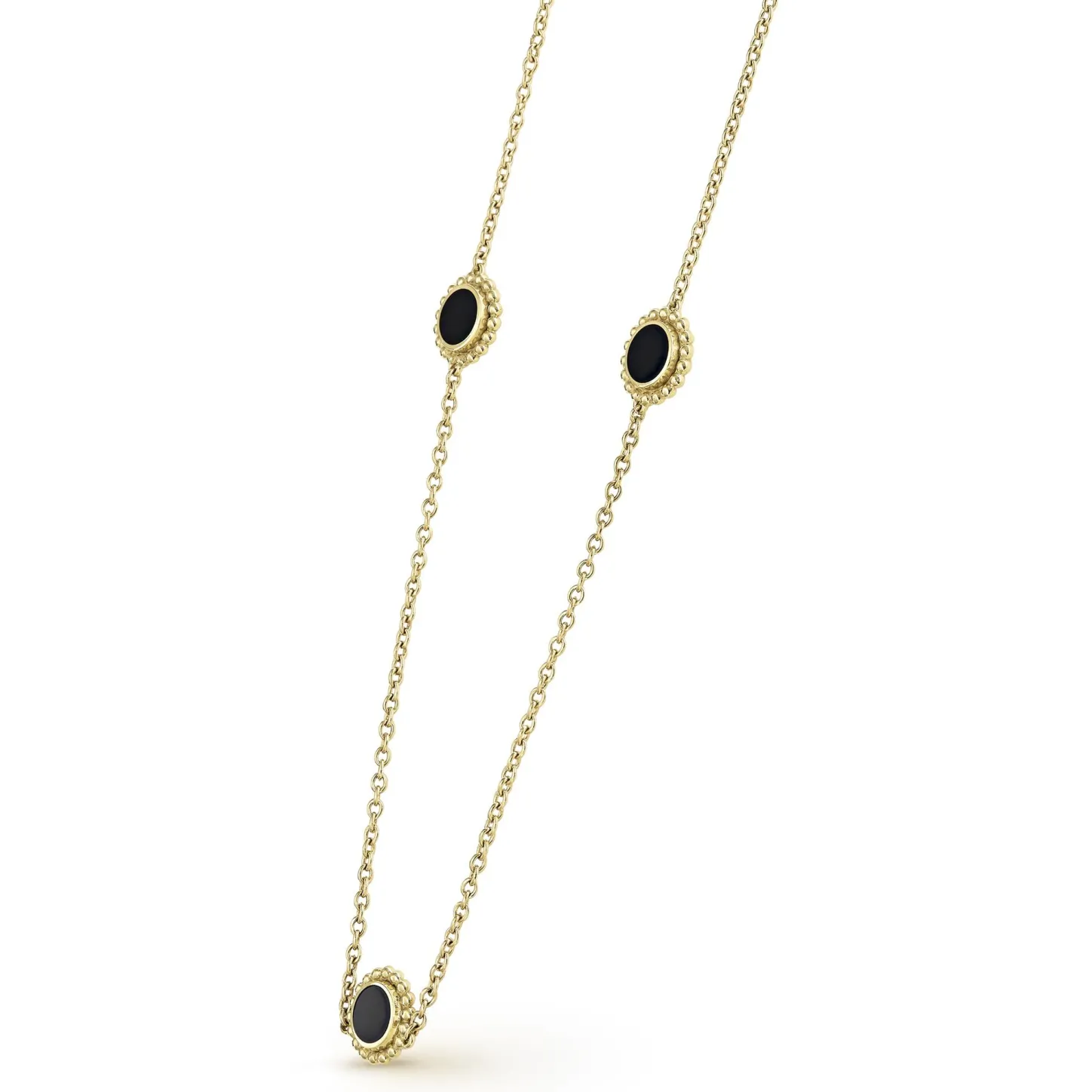 Three Round Onyx Stations Set And Surrounded By 18K Gold Caviar Beading On This Necklace.