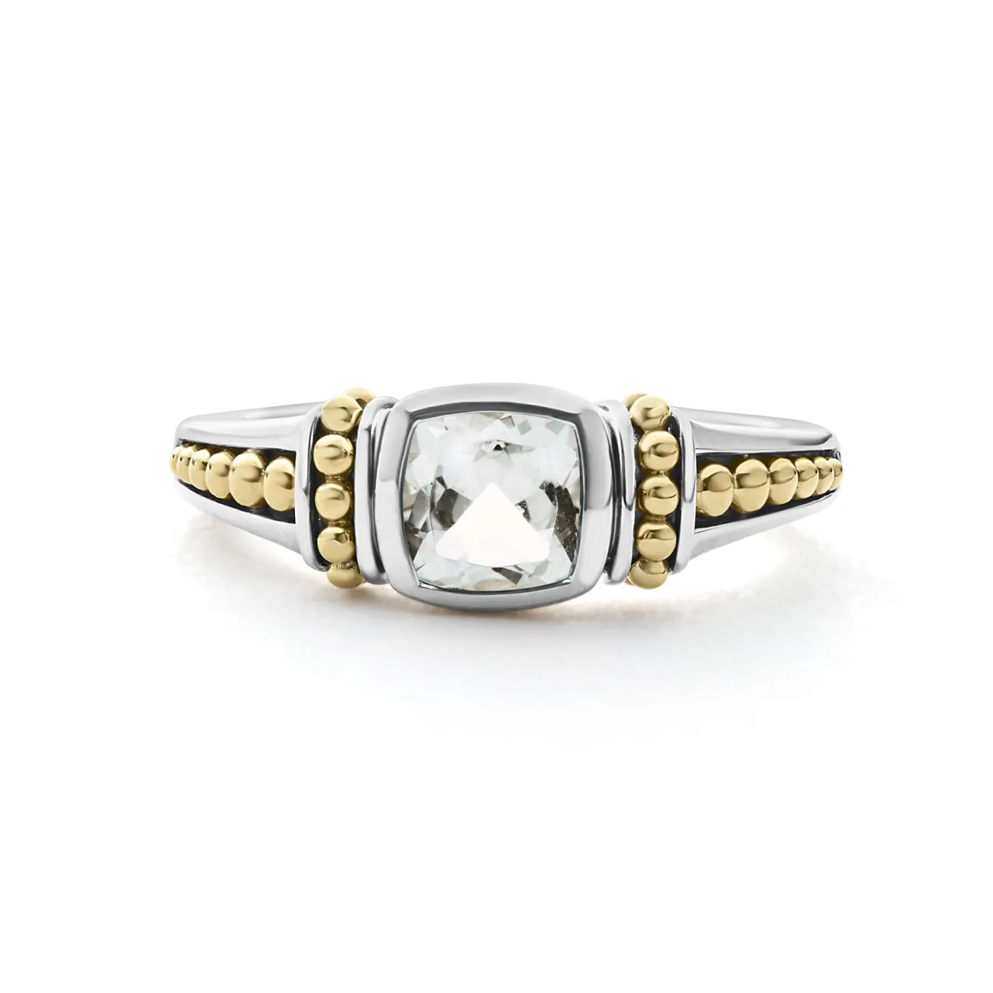 White Topaz Gemstone Ring Surrounded By Sterling Silver And 18K Gold Caviar Beading.