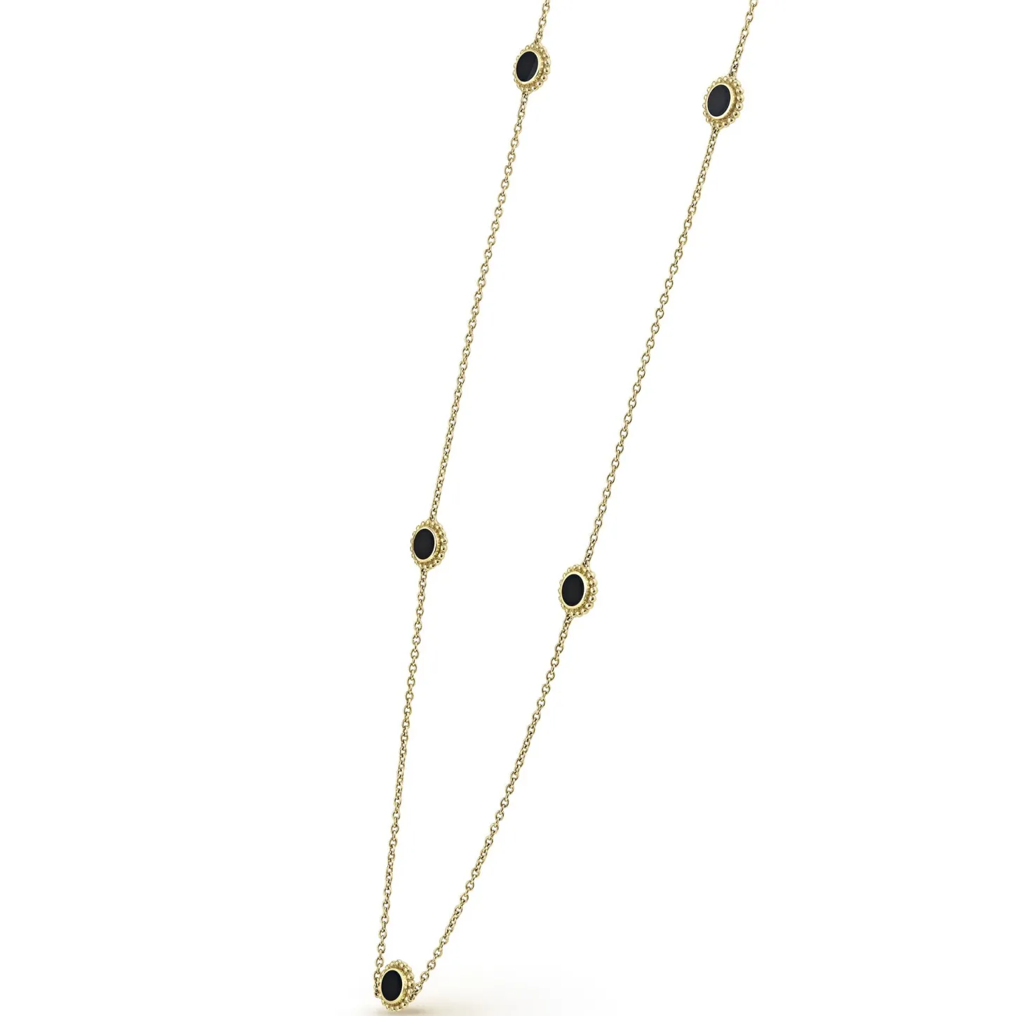 Seven Round Onyx Stations Set And Surrounded By 18K Gold Caviar Beading On This Necklace.