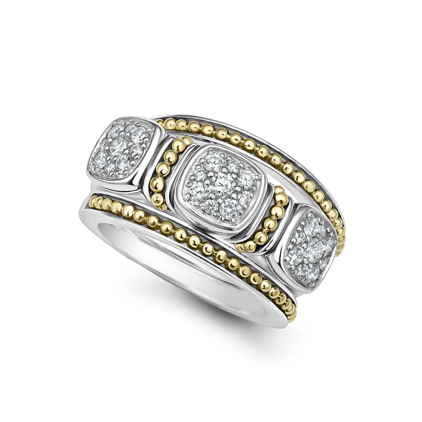 A Lagos Exclusive. A Trio Of Stacking Rings With One Diamond Ring And Two 18K Gold Caviar Beaded Rings With Sterling Silver Accents.