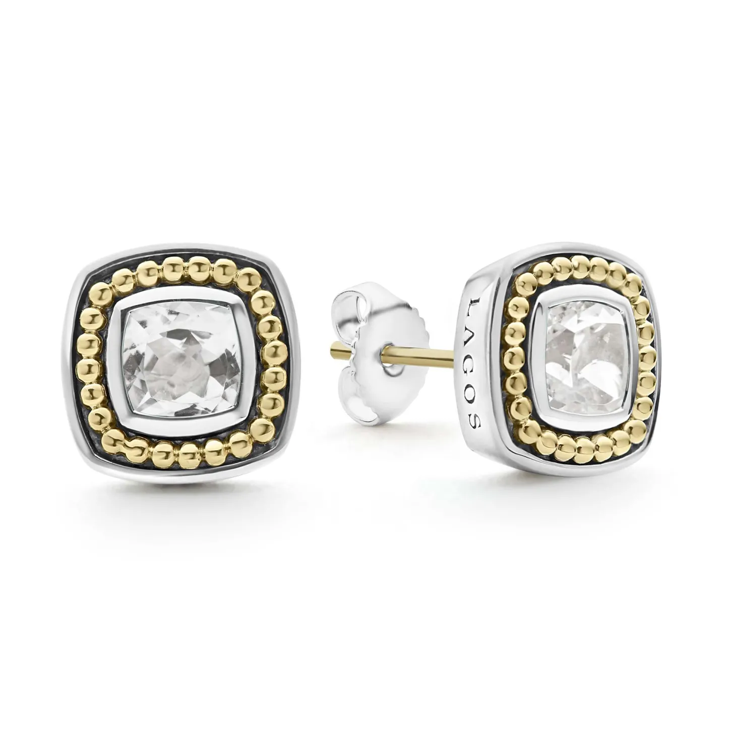 White Topaz Gemstone Stud Earrings Surrounded By Sterling Silver And 18K Gold Caviar Beading.