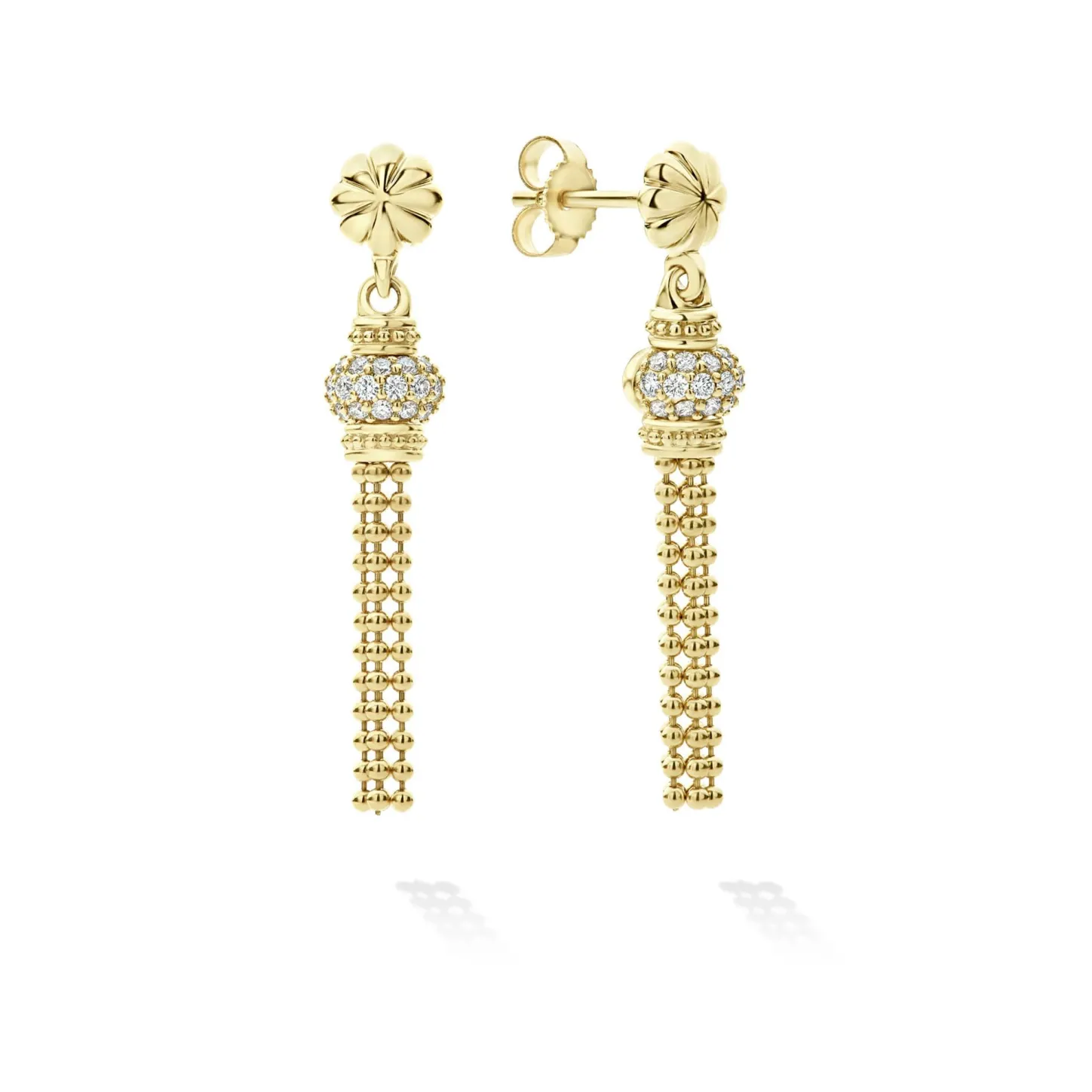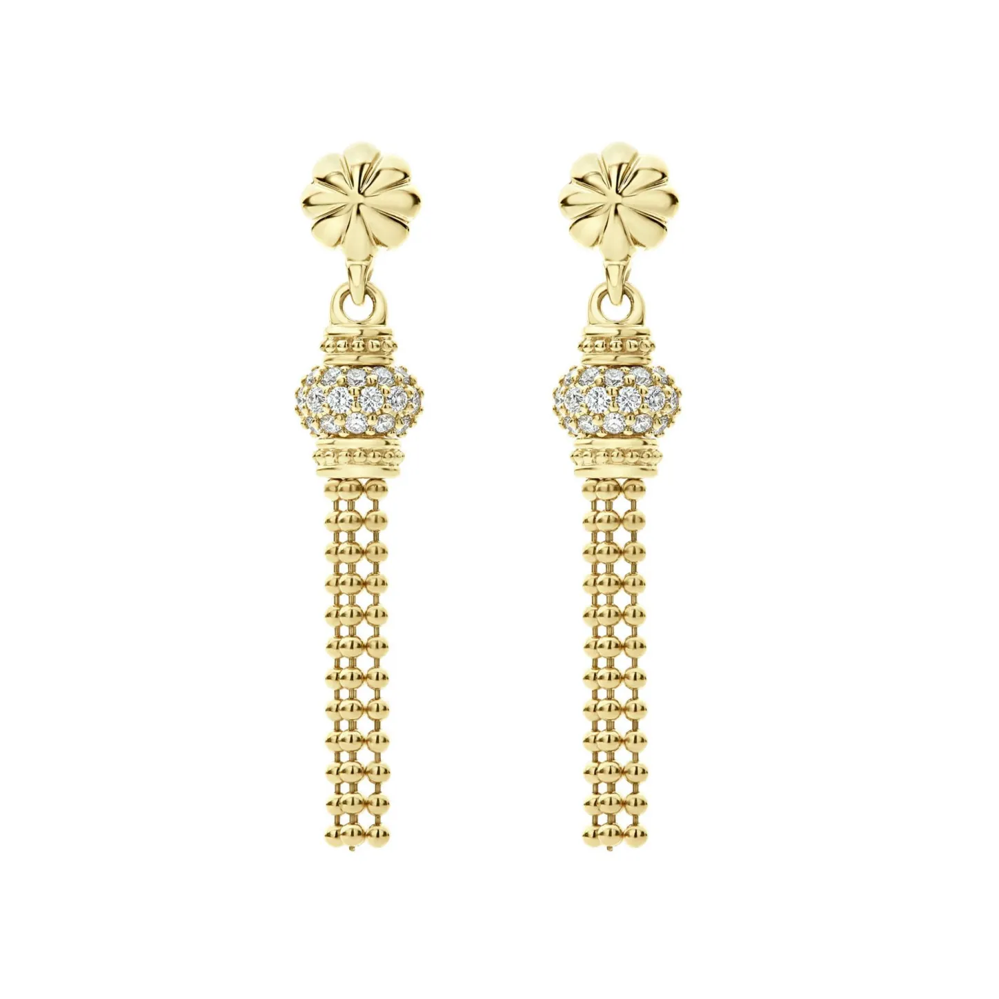 Diamonds Set With 18K Gold Form These Dramatic Drop Earrings With A Fluted Post And Caviar Beads. Lagos Diamonds Are The Highest Quality Natural Stones.