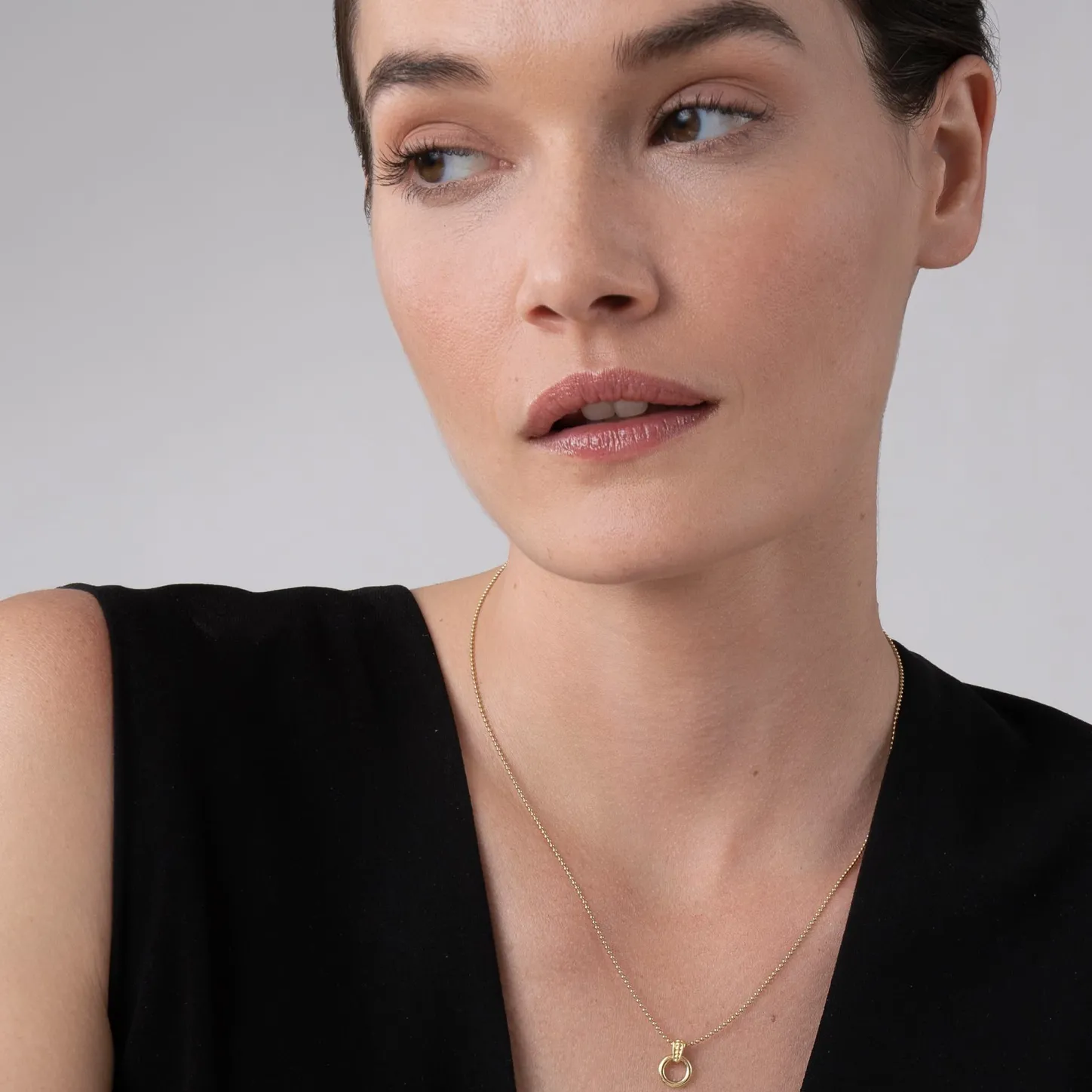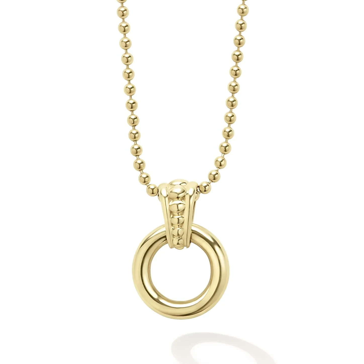 An 18K Gold Circle With A Caviar Beaded Accent Forms This Pendant On A Gold Necklace.