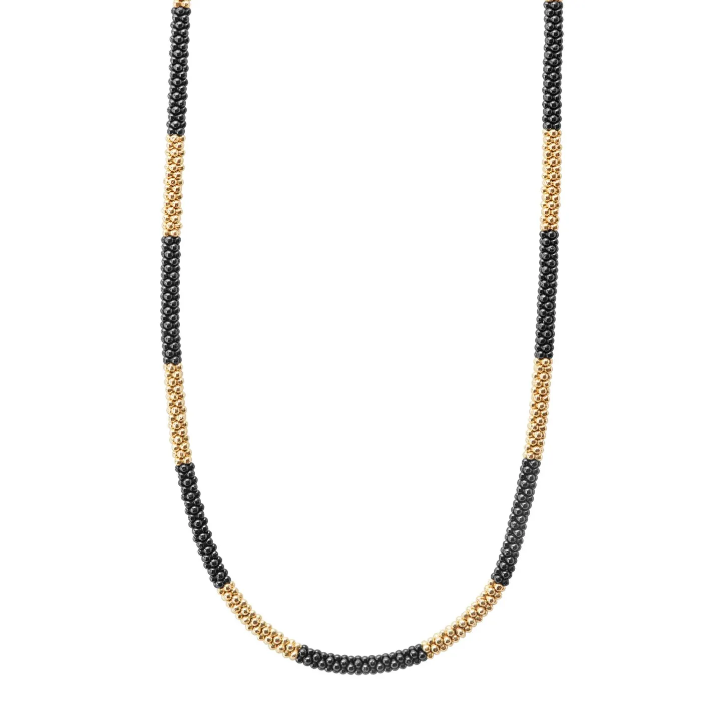 Ten 18K Gold Stations Highlighted By Black Ceramic Caviar Beading On This Necklace Finished With An 18K Gold Lobster Clasp.