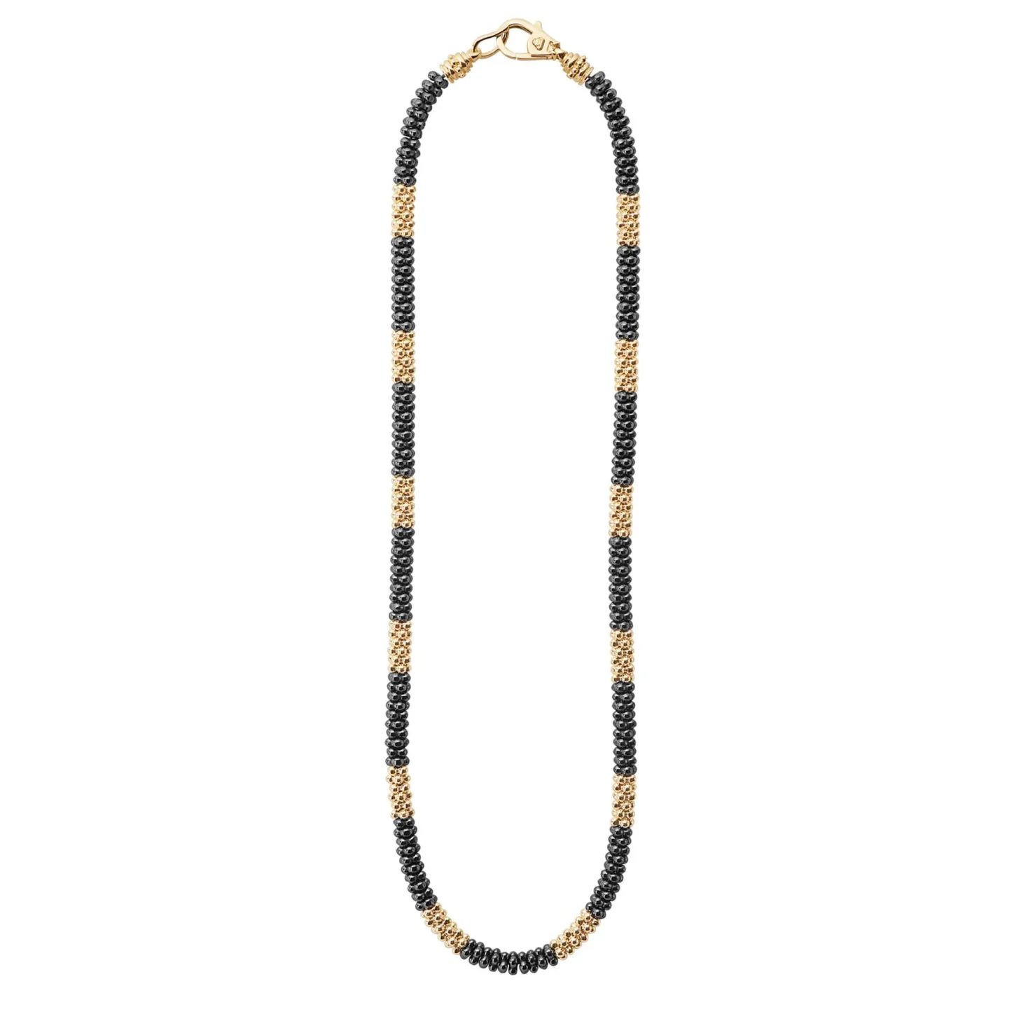 Twelve Medium 18K Gold Stations Highlighted By Black Ceramic Caviar Beading On This Necklace Finished With An 18K Gold Lobster Clasp.