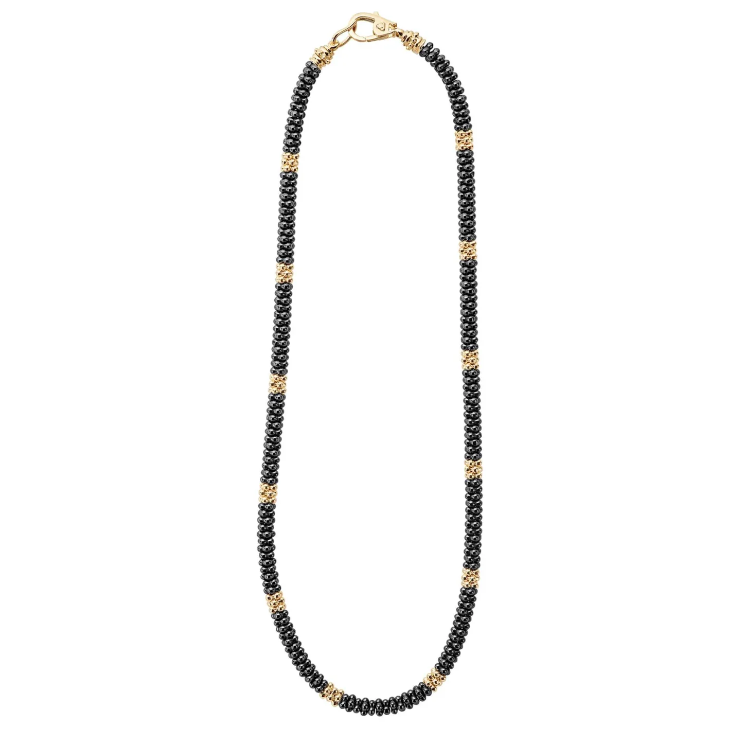 Twelve Small 18K Gold Stations Highlighted By Black Ceramic Caviar Beading On This Necklace Finished With An 18K Gold Lobster Clasp.