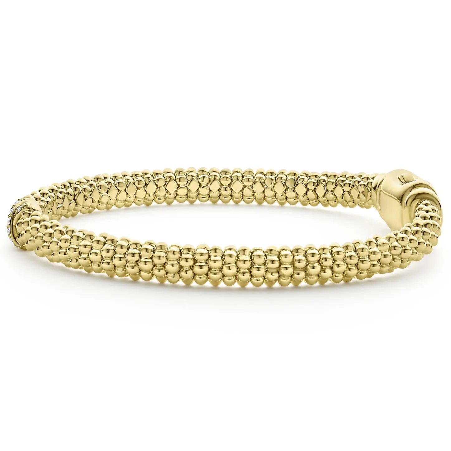 An 18K Gold Diamond X Station Wraps This Caviar Beaded Bracelet. Lagos Diamonds Are The Highest Quality Natural Stones.