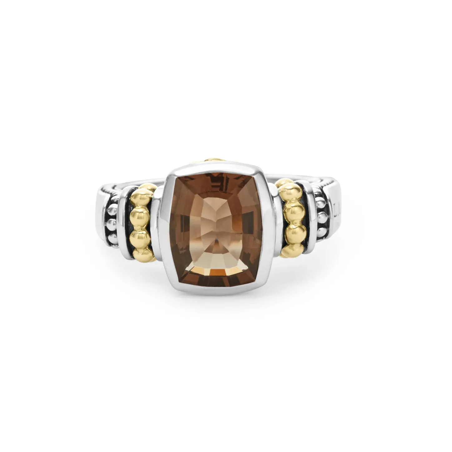 Smokey Quartz Bezel-Set Gemstone Ring With 18K Caviar Beading On A Sterling Silver Band.