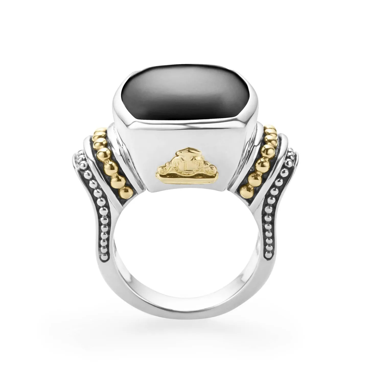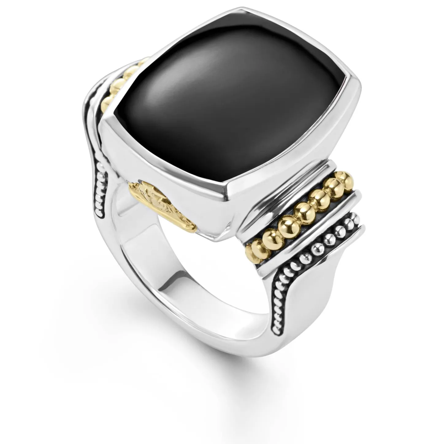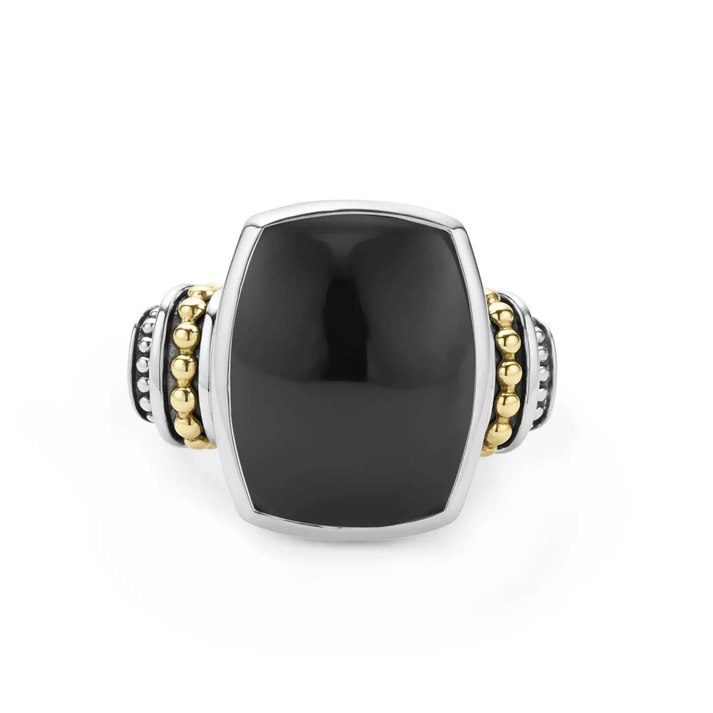 Onyx Bezel-Set Gemstone Statement Ring With 18K Caviar Beading On A Sterling Silver Band.