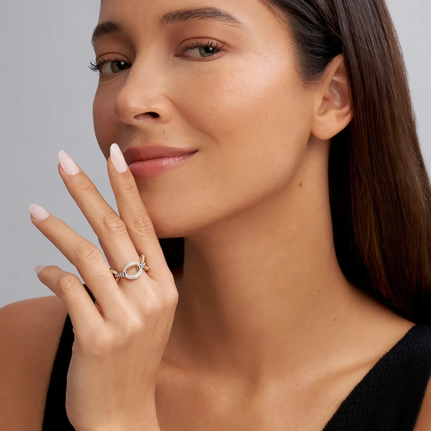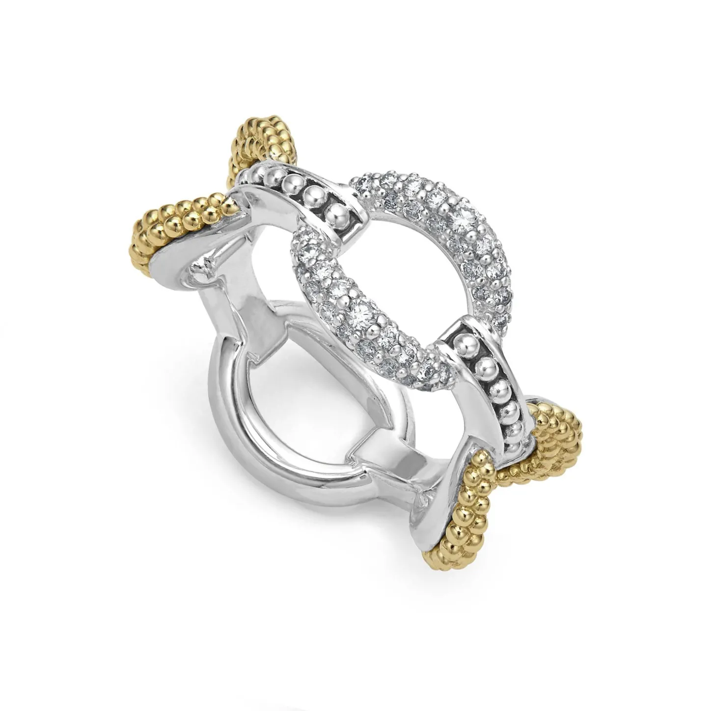 18K Gold And Sterling Silver Variations Of Caviar Beading & Fluting Elements Accented By Diamonds Form This Oval Link Ring. Lagos Diamonds Are The Highest Quality Natural Stones.