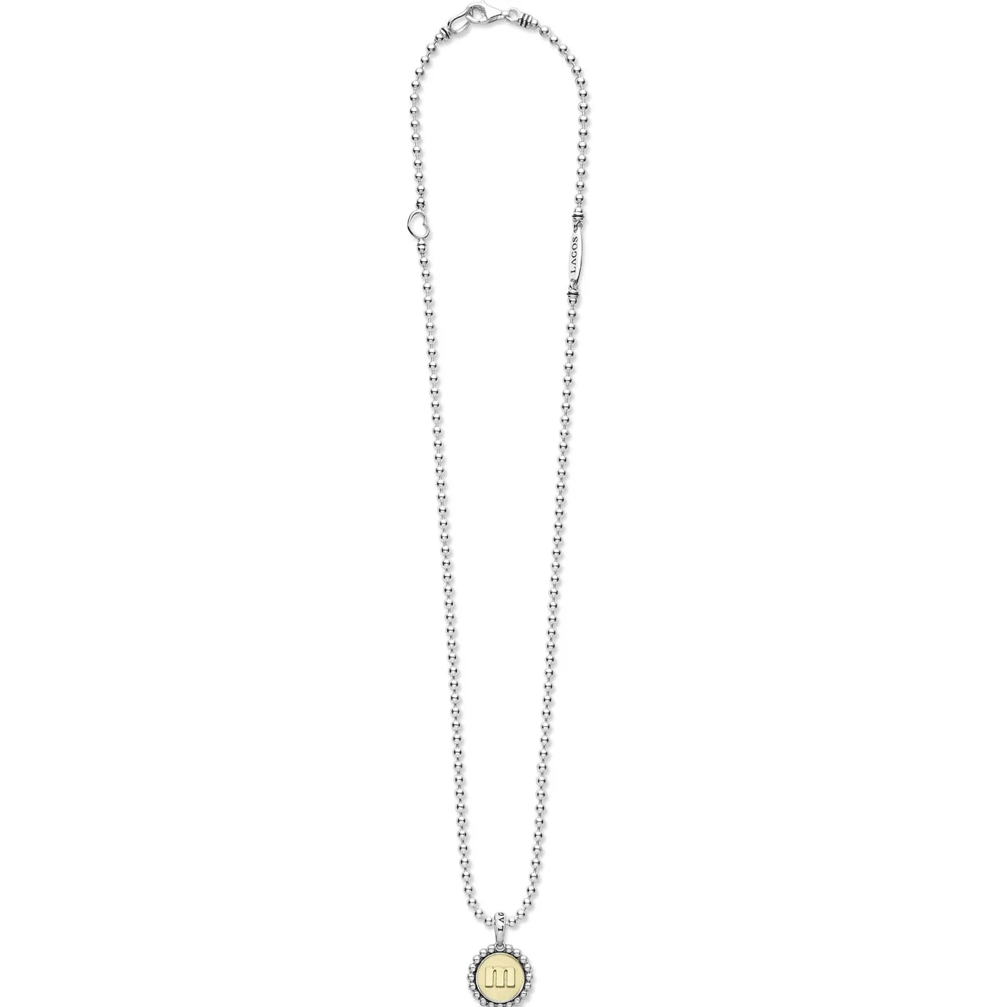 Our Signature Caviar Sterling Silver And 18K Gold Initial ‘M’ Charm Finished On A Sterling Silver Ball Chain Necklace.