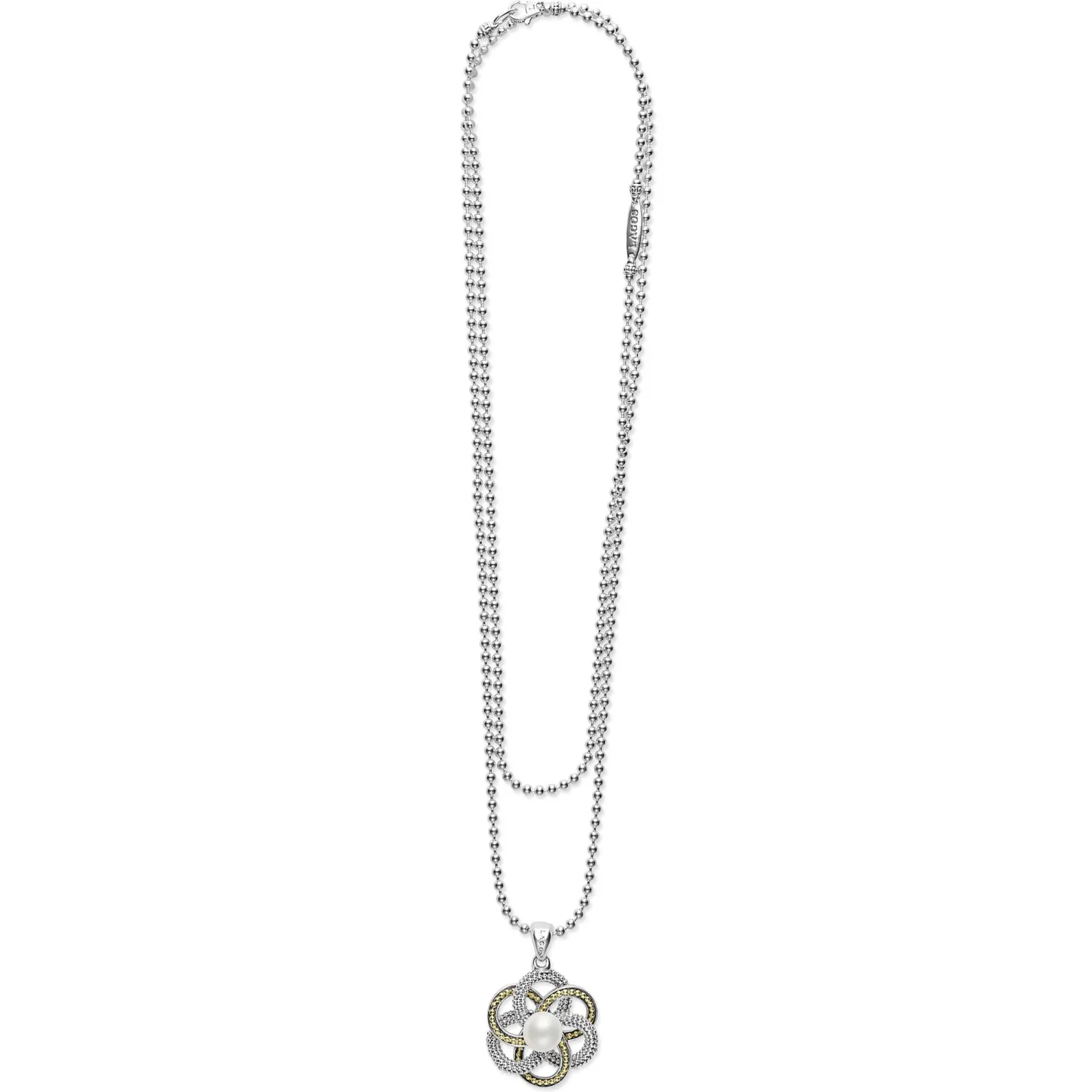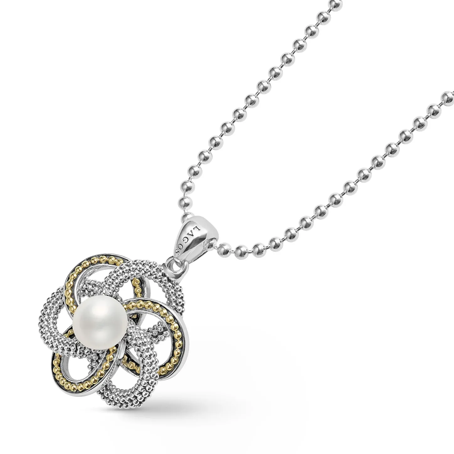 A Pearl Is The Center Of This 18K Gold And Sterling Silver Caviar Beaded Pendant Finished On A Sterling Silver Ball Chain Necklace.