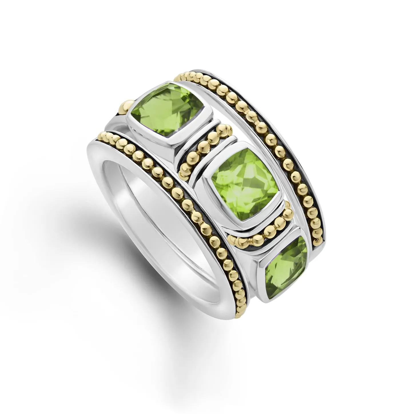 A Trio Of Stacking Rings With One Peridot Ring And Two 18K Gold Caviar Beaded Rings With Sterling Silver Accents.