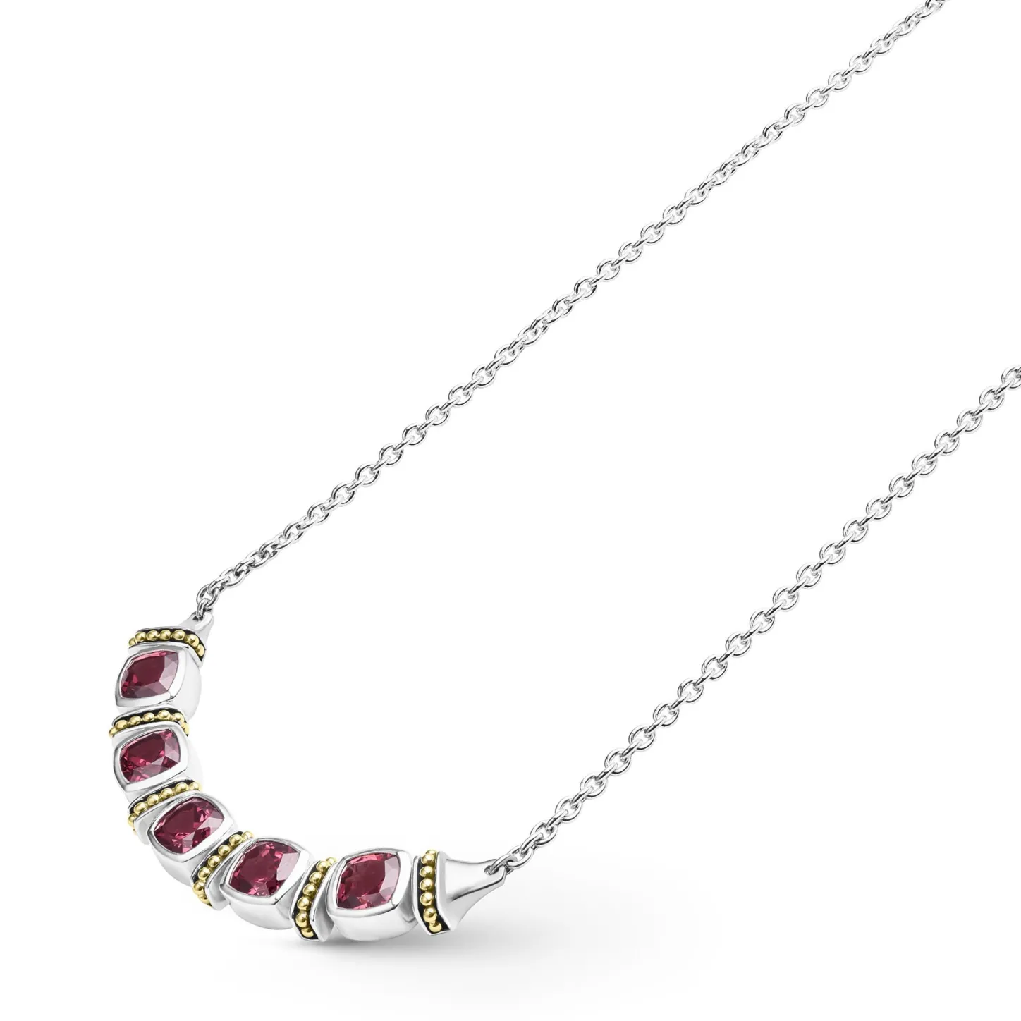Five Rhodolite Garnet Gemstones Accent This Necklace Surrounded By Sterling Silver And 18K Gold Caviar Beading.