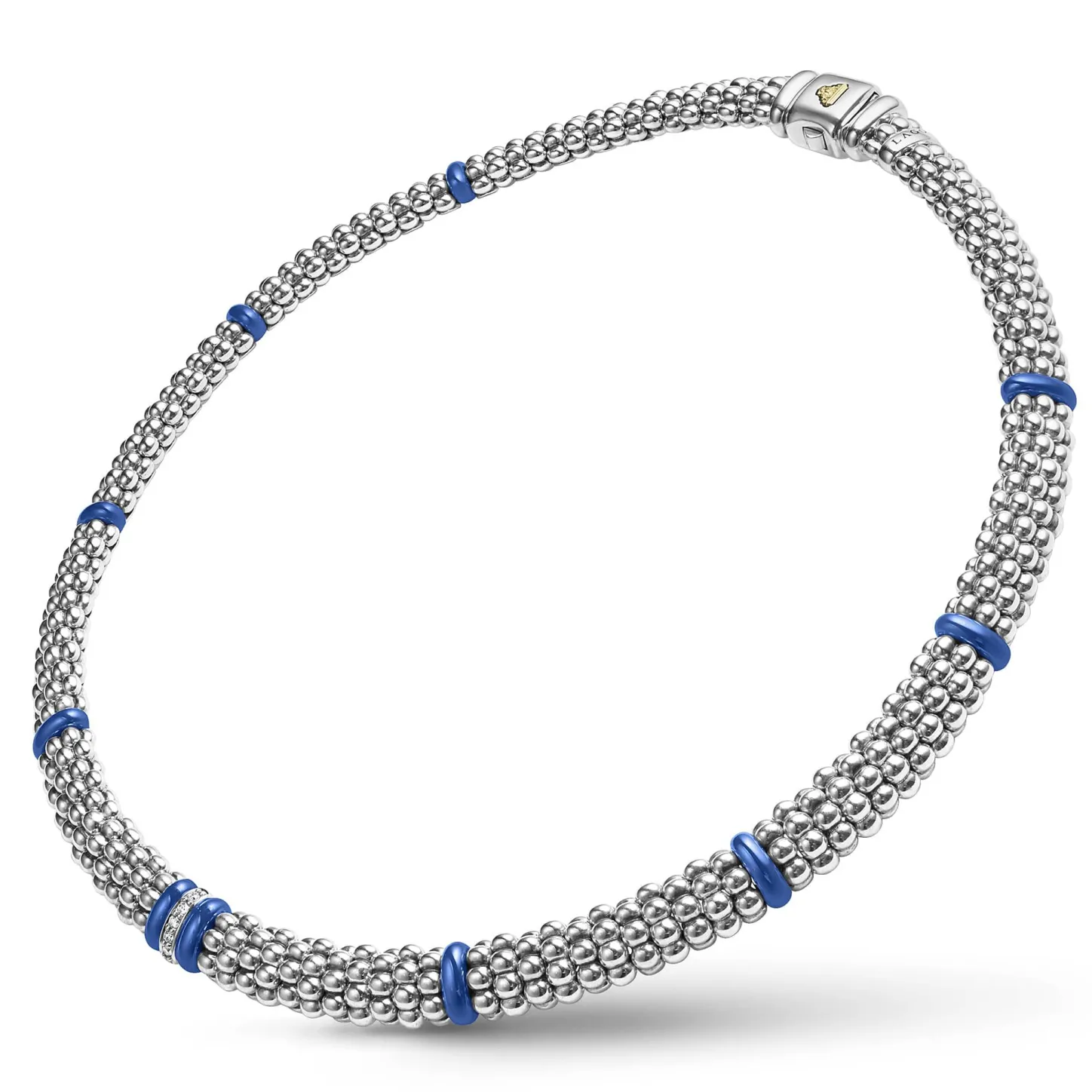 One Diamond Station Set In Sterling Silver Surrounded By Ten Ultramarine Ceramic Stations With Sterling Silver Caviar Beading. Lagos Diamonds Are The Highest Quality Natural Stones.
