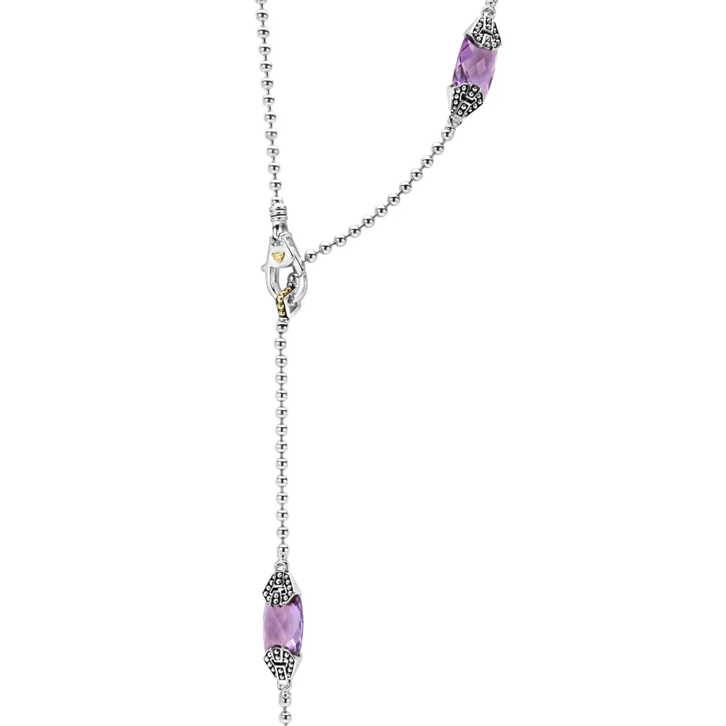 Six Amethyst Gemstone Stations Highlighted By Caviar Beading With Seven Sterling Silver Open Square Motifs Highlighted By 18K Gold On A Sterling Silver Ball Chain Strand.