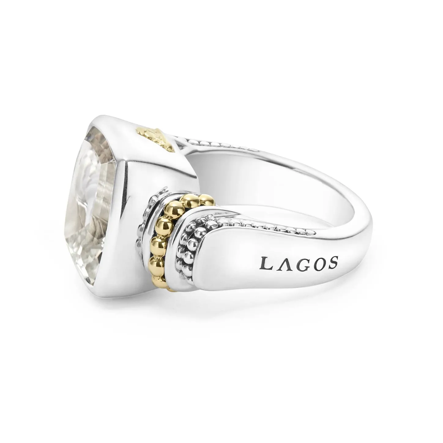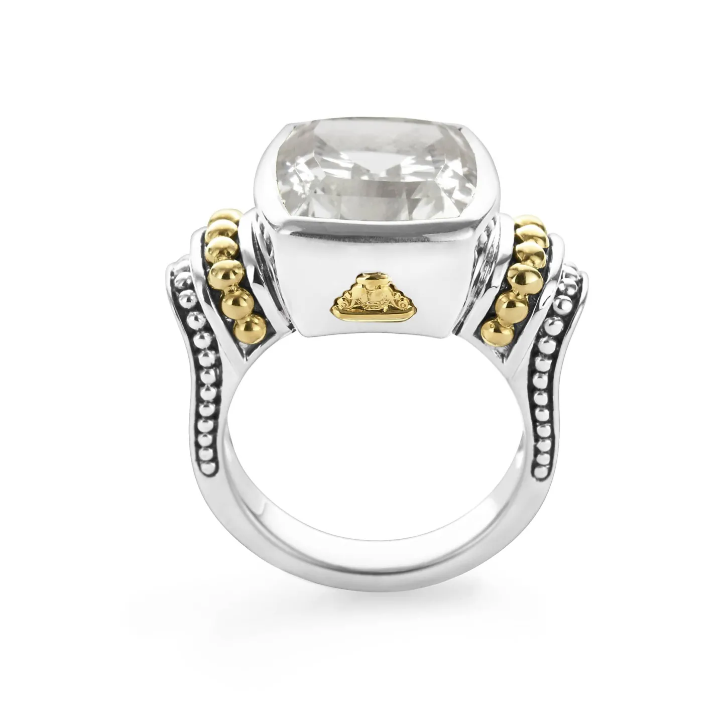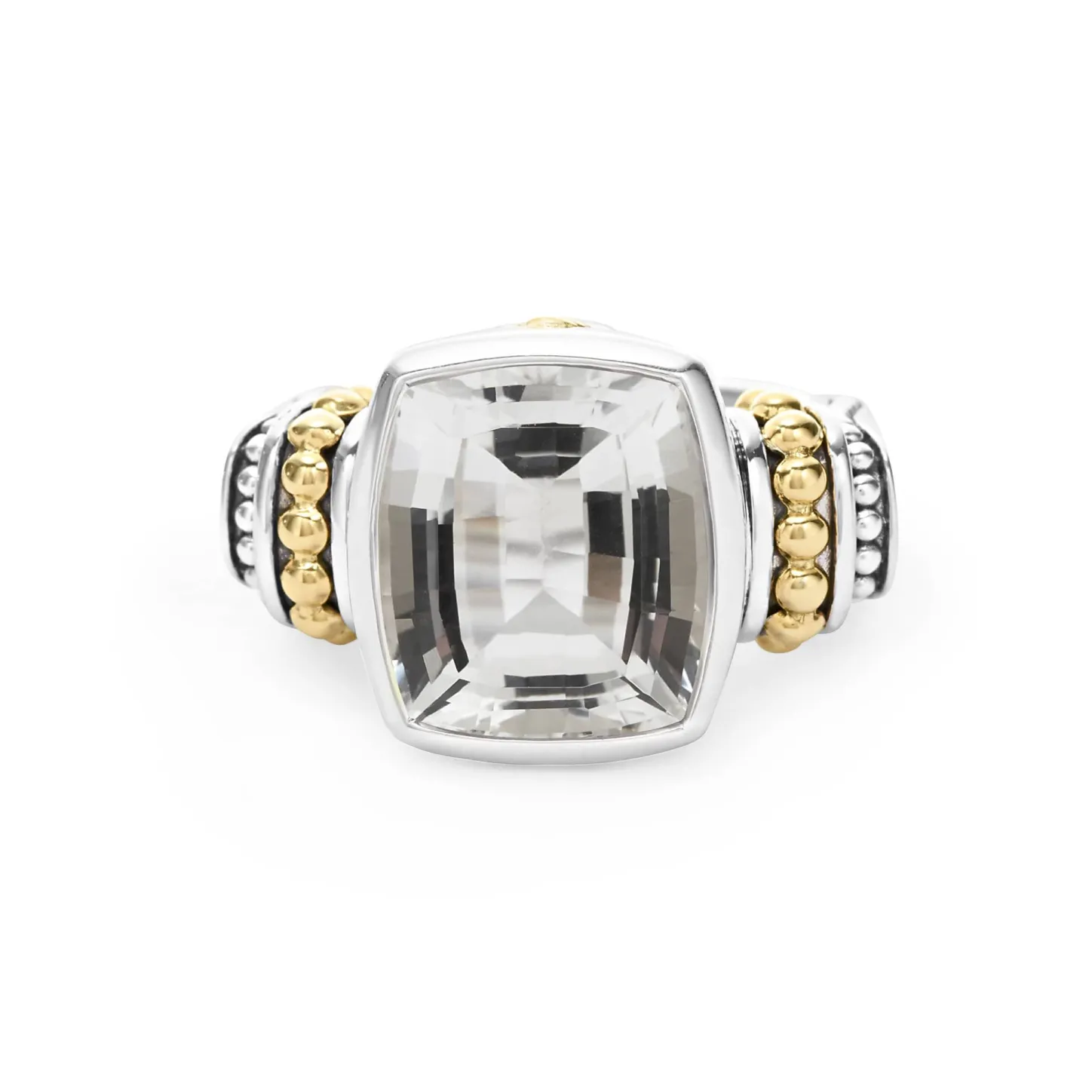 White Topaz Bezel-Set Gemstone Ring With 18K Gold Caviar Beading On A Sterling Silver Band.