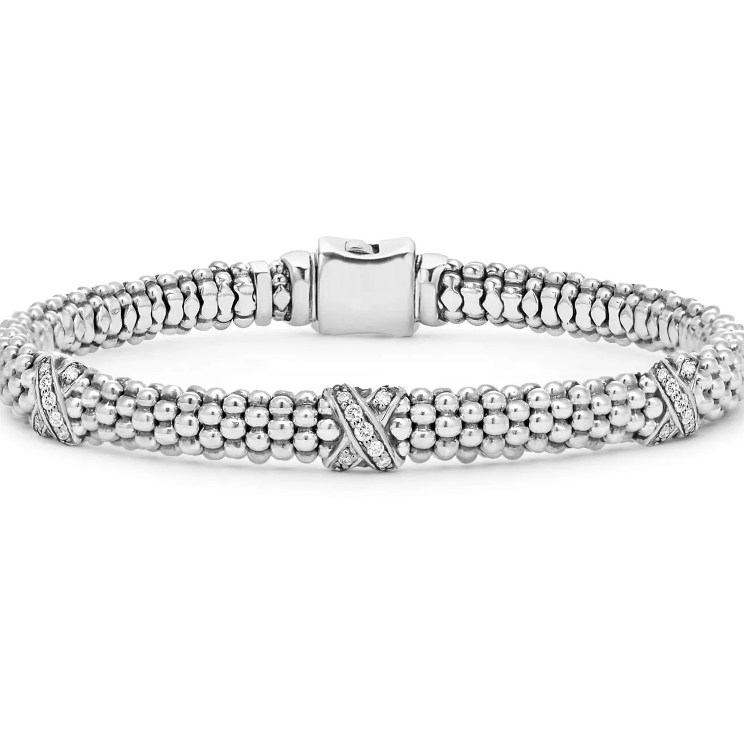 Three Pavé Diamond Sterling Silver X Stations On This Classic Caviar Beaded Bracelet. Lagos Diamonds Are The Highest Quality Natural Stones.