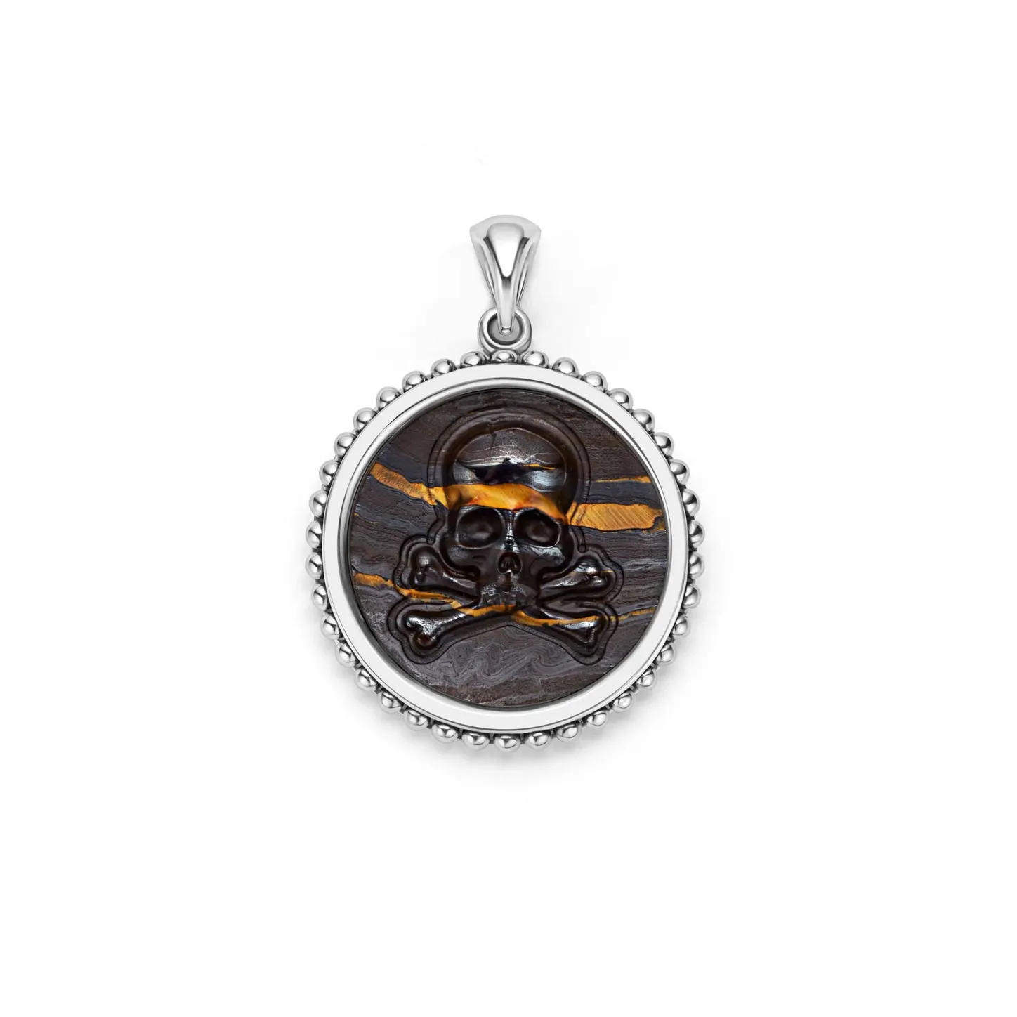 Tiger Iron Gemstone Surrounded By Sterling Silver Caviar Beading Form This Crossbone Emblem Amulet.