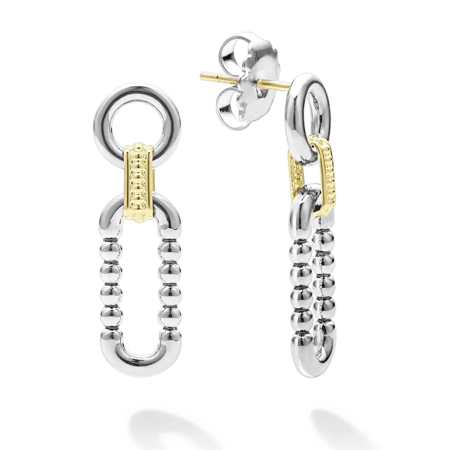 - One Set Of Sterling Silver And 18K Gold Link Drop Earrings Created From Variations Of Caviar Beading & Fluting Elements.