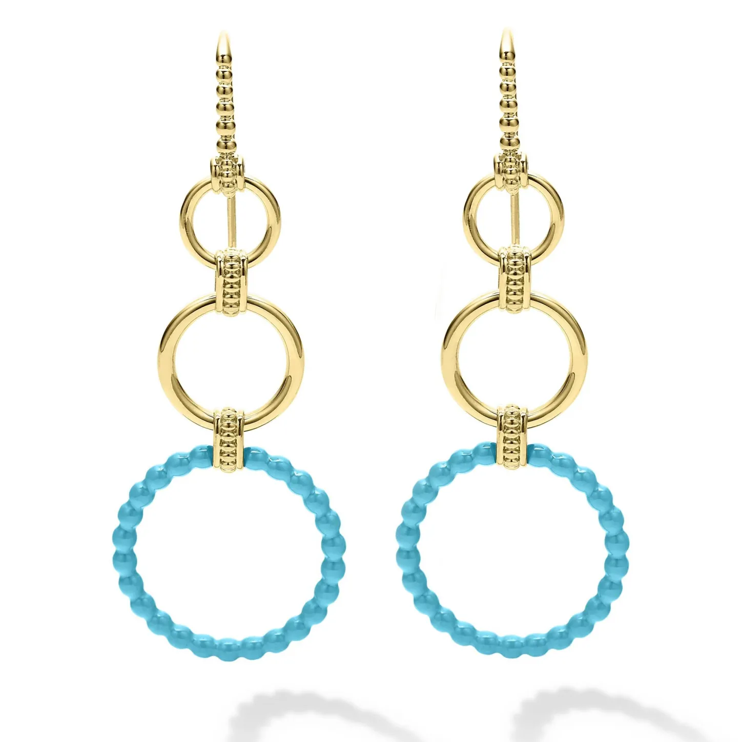 Graduated Circle Drop Earrings With Smooth 18K Gold And Blue Ceramic.