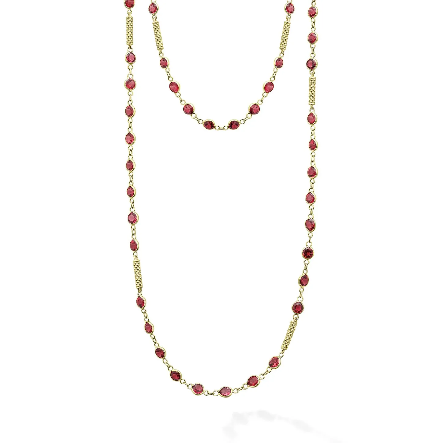 18K Gold Stations Surrounded By Rhodolite Garnet Gemstones And Caviar Beading Form This Chain Necklace.
