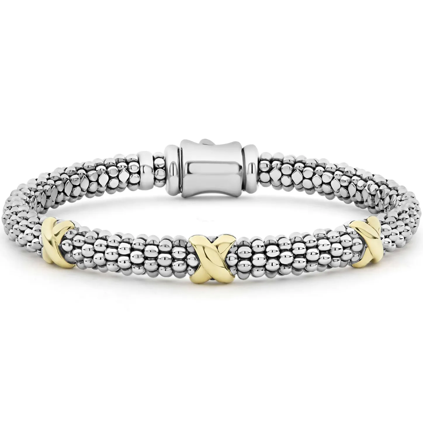 - One Two-Tone Bracelet With Three 18K Gold X Stations And Sterling Silver Caviar Beading. Set Includes Size Medium.
