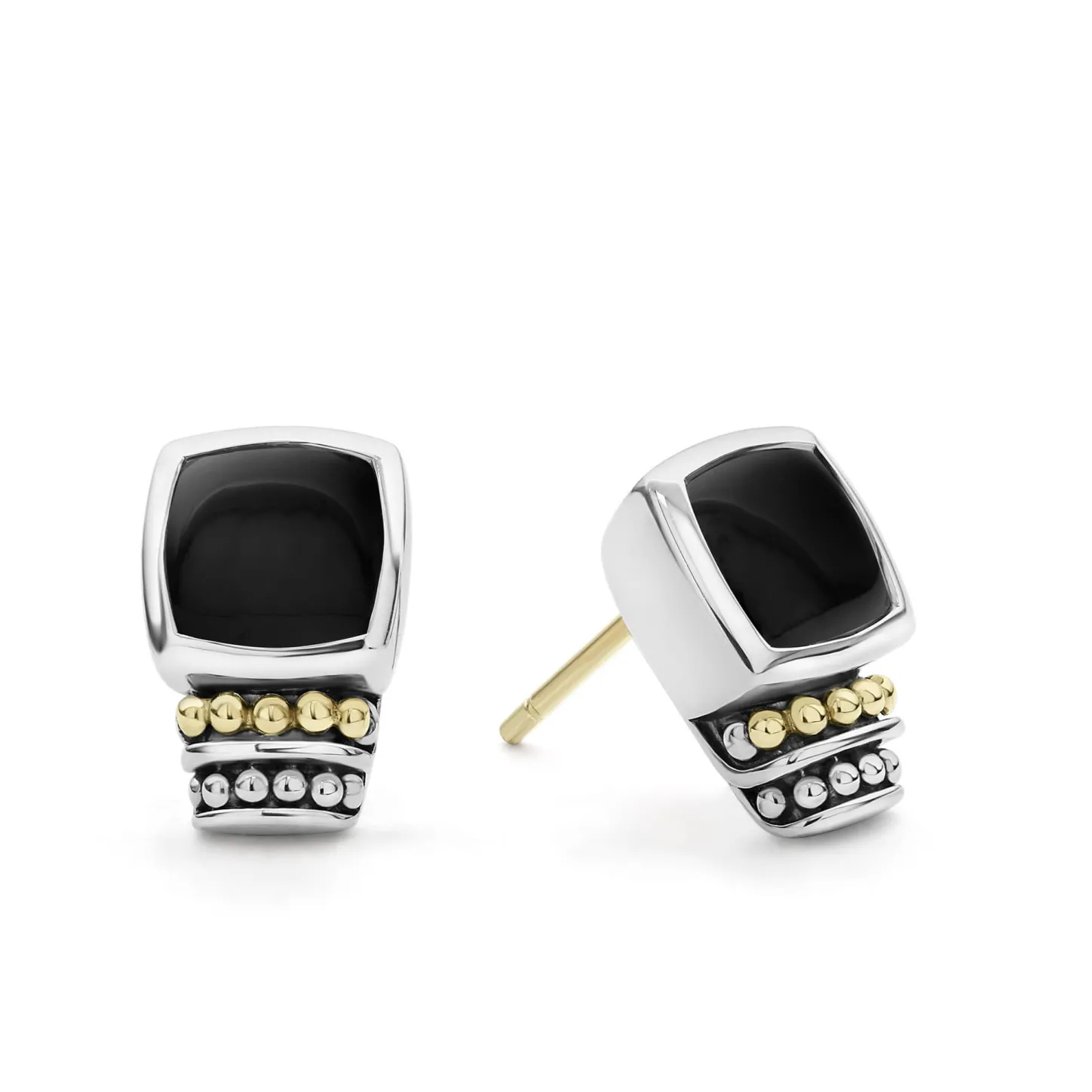 Onyx Bezel-Set Gemstone Stud Earrings With 18K Gold And Sterling Silver Caviar Beaded Accents.