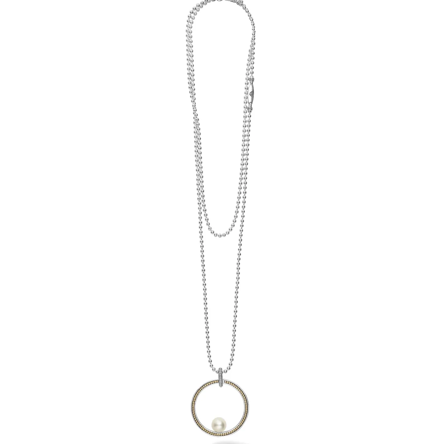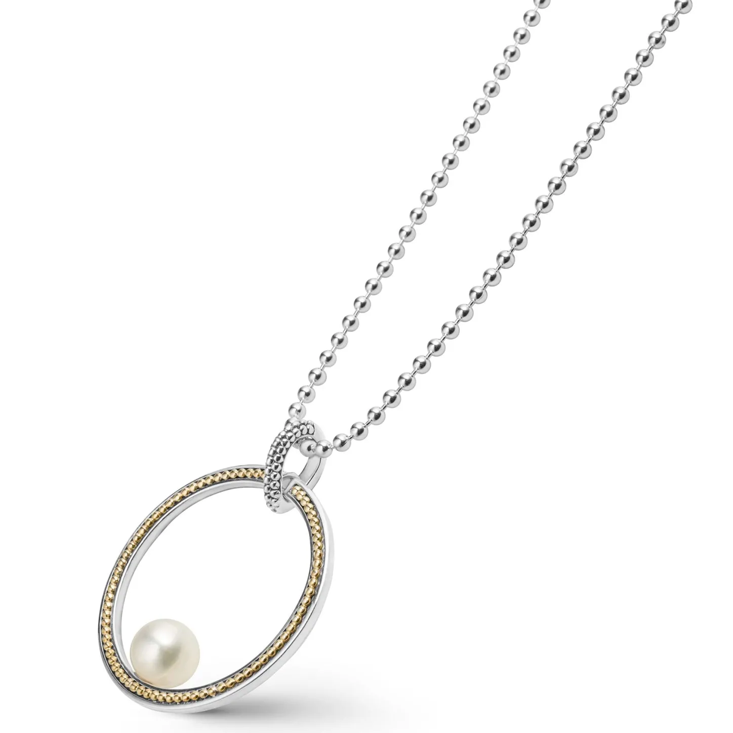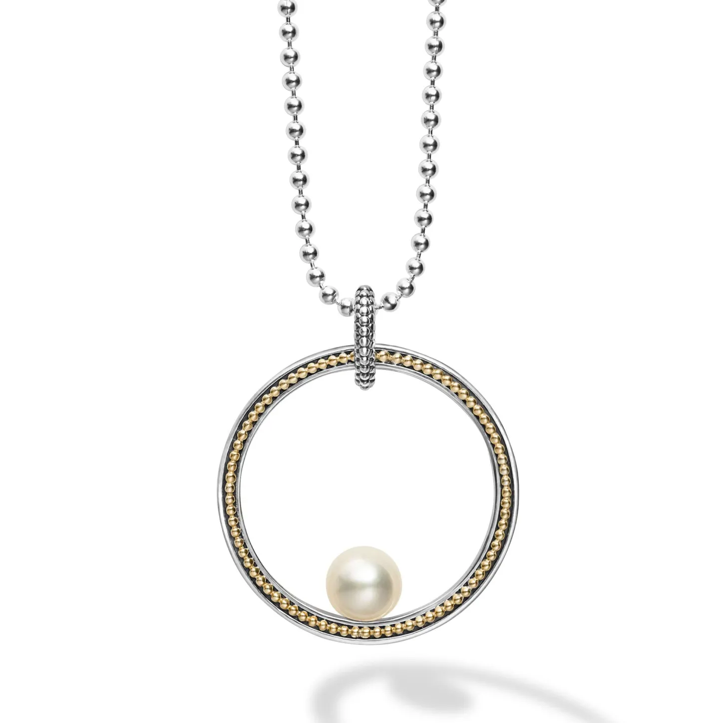 One Cultured Freshwater Pearl Sits In A Large Circle Pendant Detailed With Caviar Beading In 18K Gold And Sterling Silver. Finished On A 34 Inch Versatile Ball Chain Necklace.