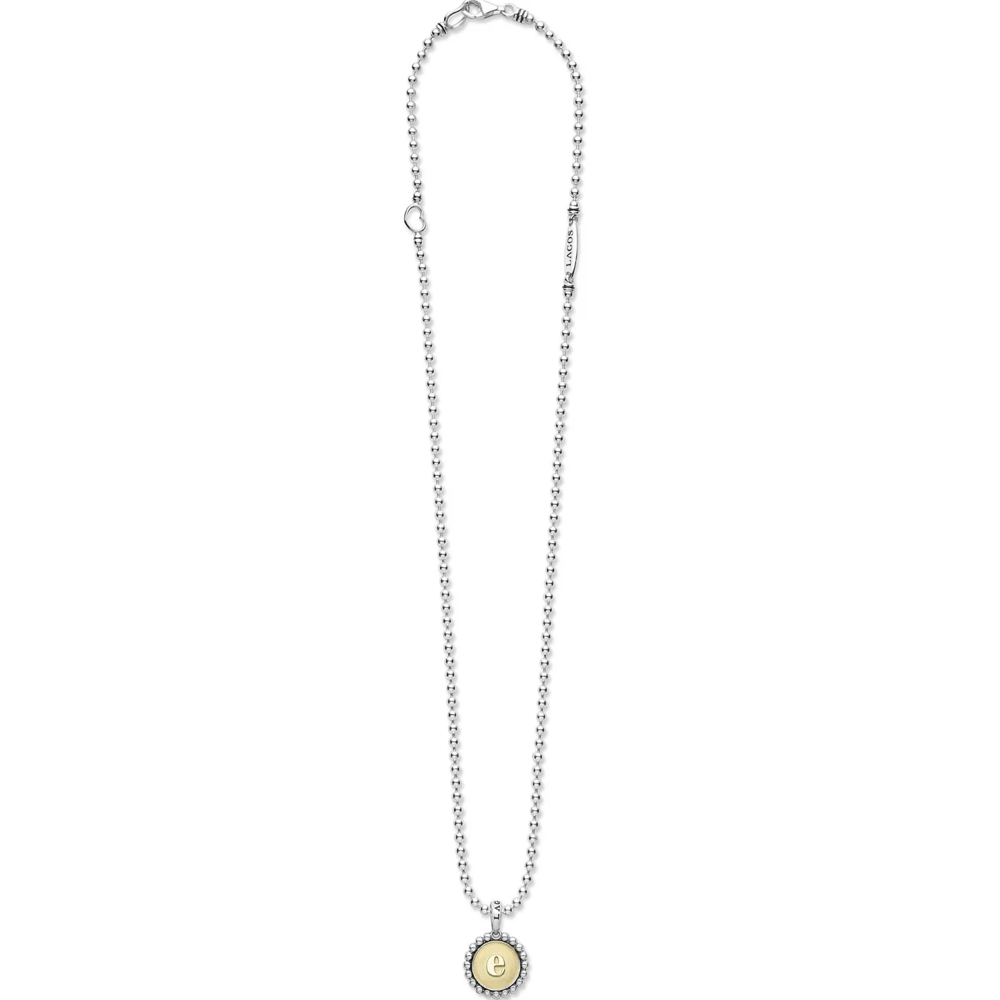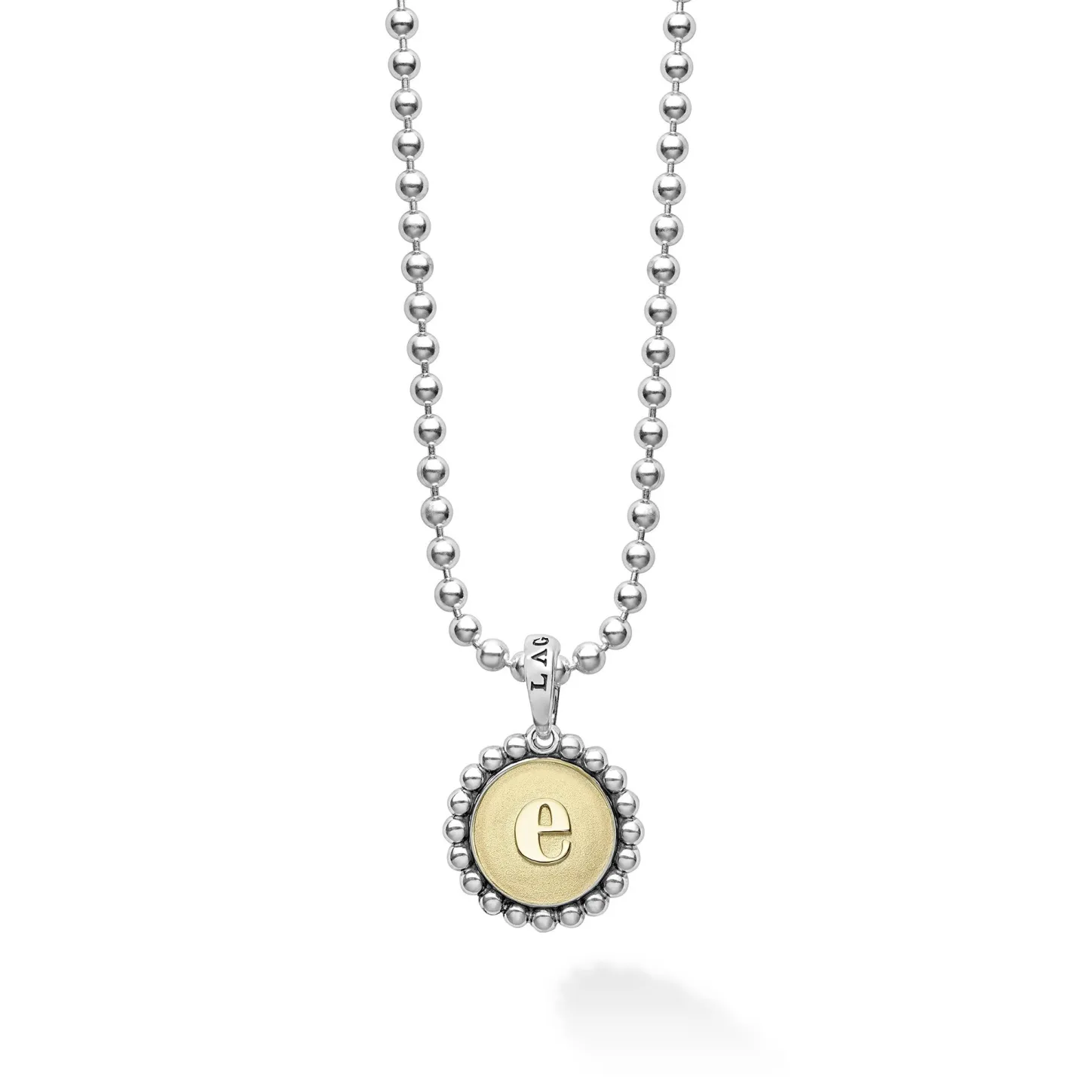 Our Signature Caviar Sterling Silver And 18K Gold Initial ‘E’ Charm Finished On A Sterling Silver Ball Chain Necklace.