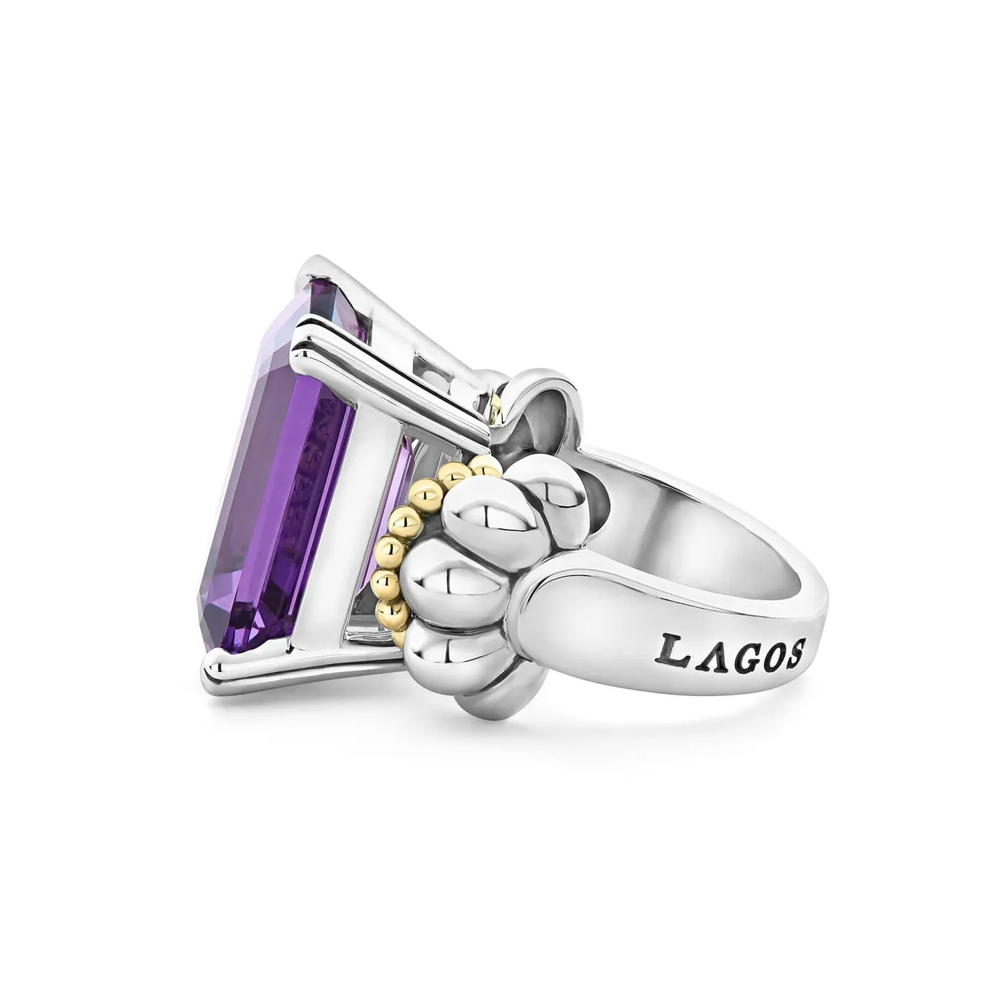 The Return Of A Lagos Icon. Our Signature Emerald-Cut Amethyst Gemstone Ring With A Prong Setting In Sterling Silver And 18K Gold Caviar Beading.