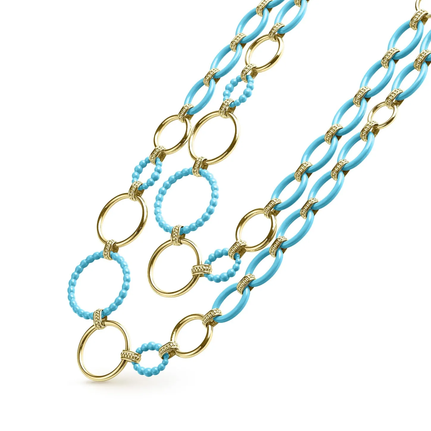 A 36 Inch Long Necklace With 18K Gold And Blue Ceramic Round, Oval And Beaded Links.