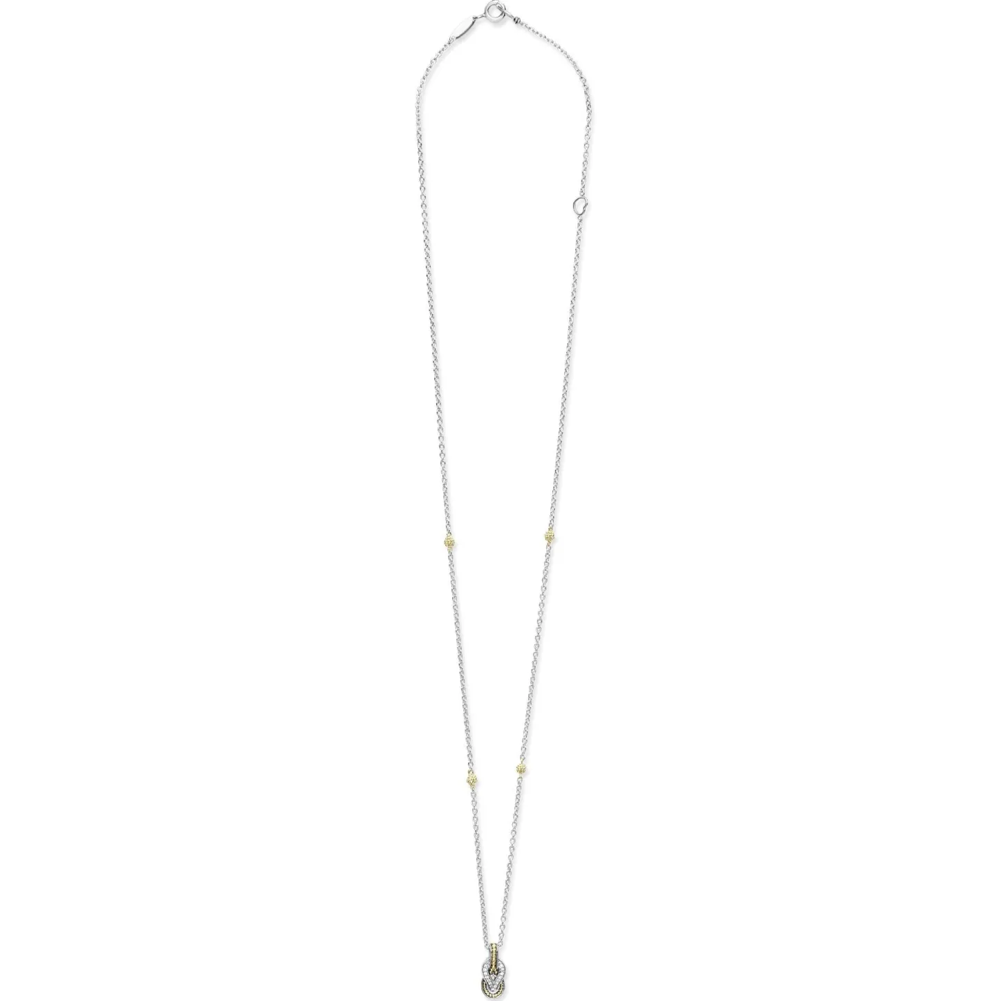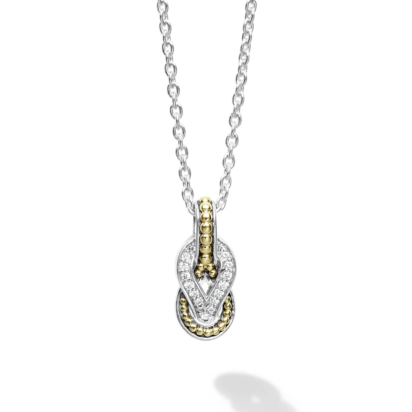 Diamond And 18K Gold Knot Pendant Finished On A Versatile Link Necklace With Four Caviar Beaded Stations. Lagos Diamonds Are The Highest Quality Natural Stones.