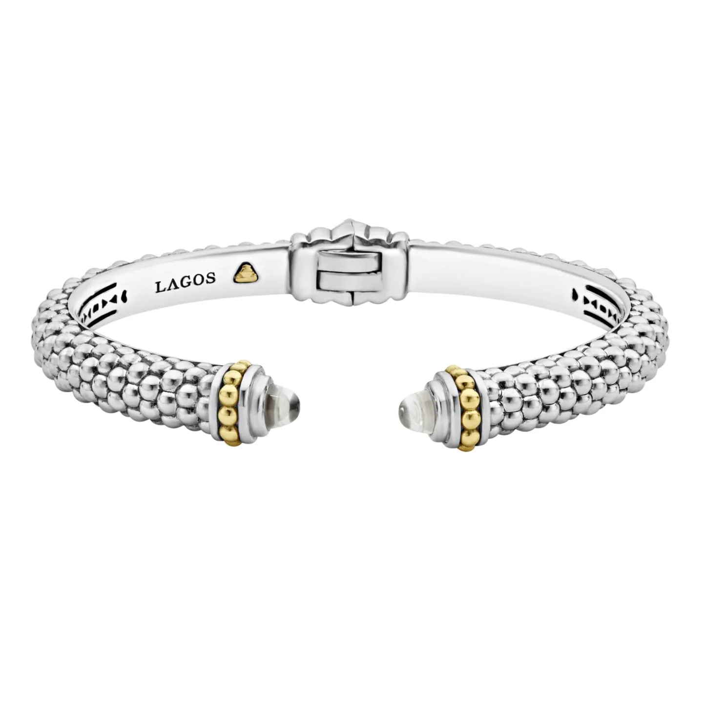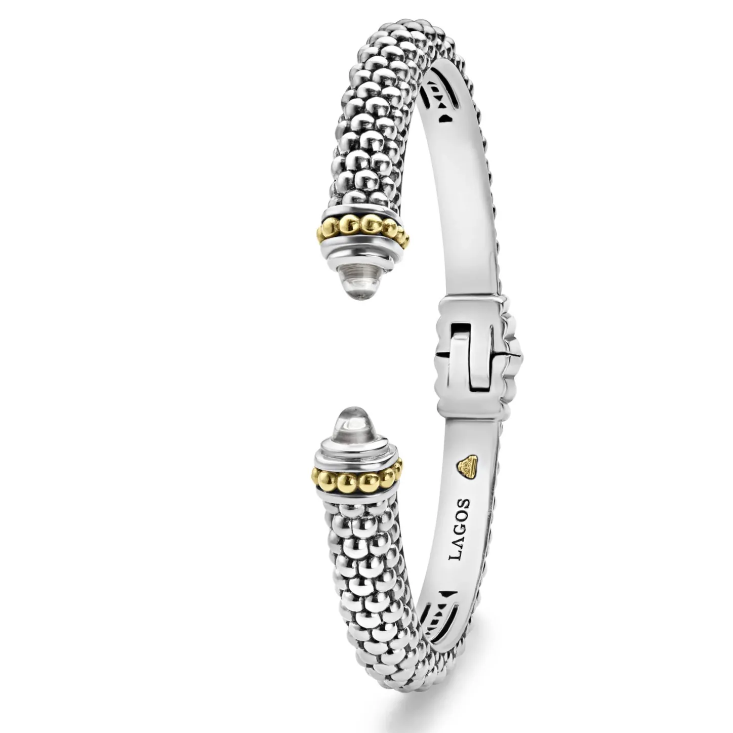 Caviar Beading And Highly Polished Sterling Silver Stations Comprise This Innovative Cuff Bracelet Detailing White Topaz Gemstone End Caps.