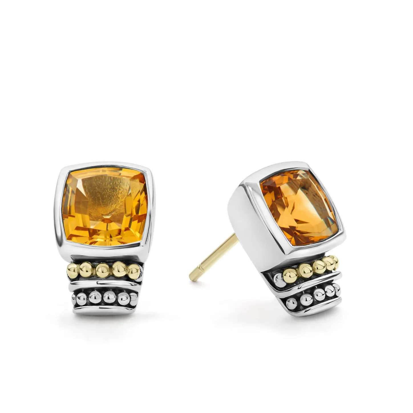 Citrine Bezel-Set Gemstone Stud Earrings With 18K Gold And Sterling Silver Caviar Beaded Accents.