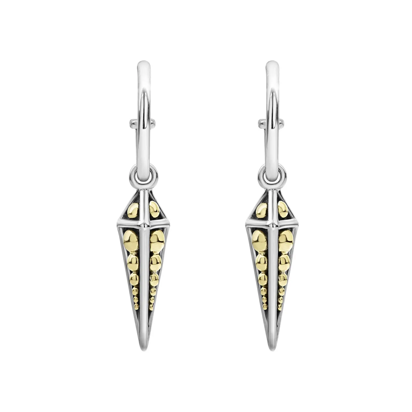 Drop Pyramid Charms With 18K Gold And Sterling Silver Caviar Beading On A Sterling Silver Hoop.