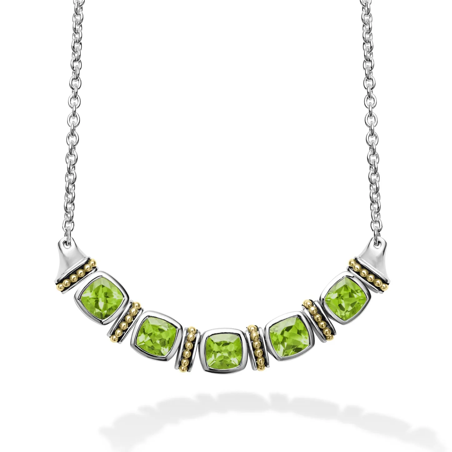 Five Peridot Gemstones Accent This Necklace Surrounded By Sterling Silver And 18K Gold Caviar Beading.