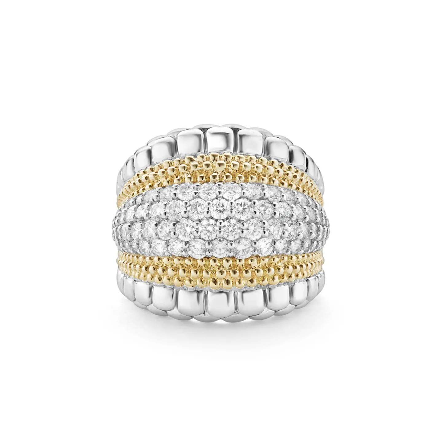 Diamonds And 18K Gold Caviar Beading Form This Statement Ring. Lagos Diamonds Are The Highest Quality Natural Stones.