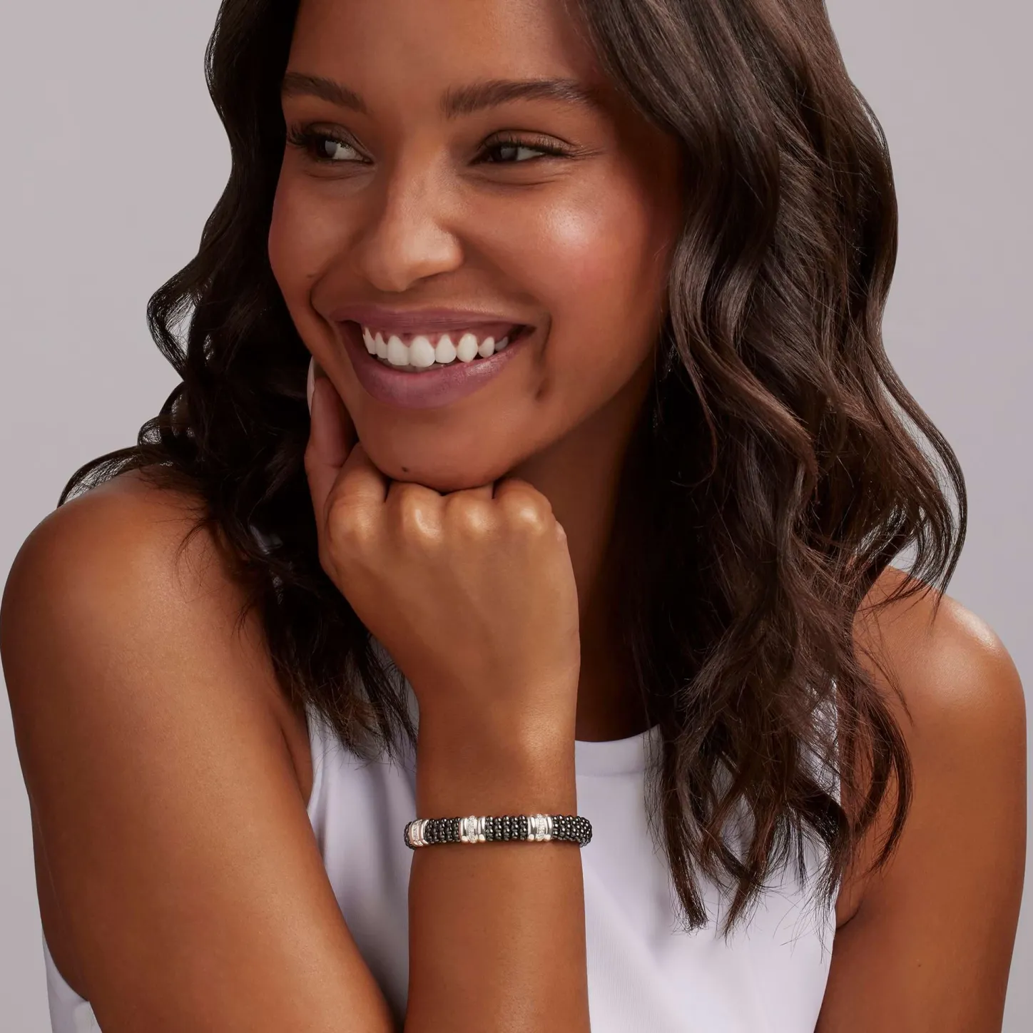 Three Diamond And Sterling Silver Stations Set In A Black Ceramic Beaded Bracelet. Lagos Diamonds Are The Highest Quality Natural Stones.