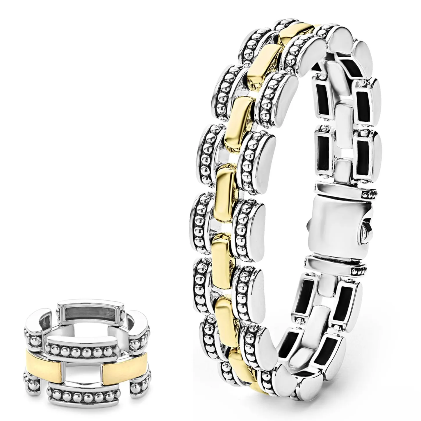 - One 18K Gold And Sterling Silver Link Ring Crafted With Smooth Stations And Caviar Beading. Set Includes Size 7.