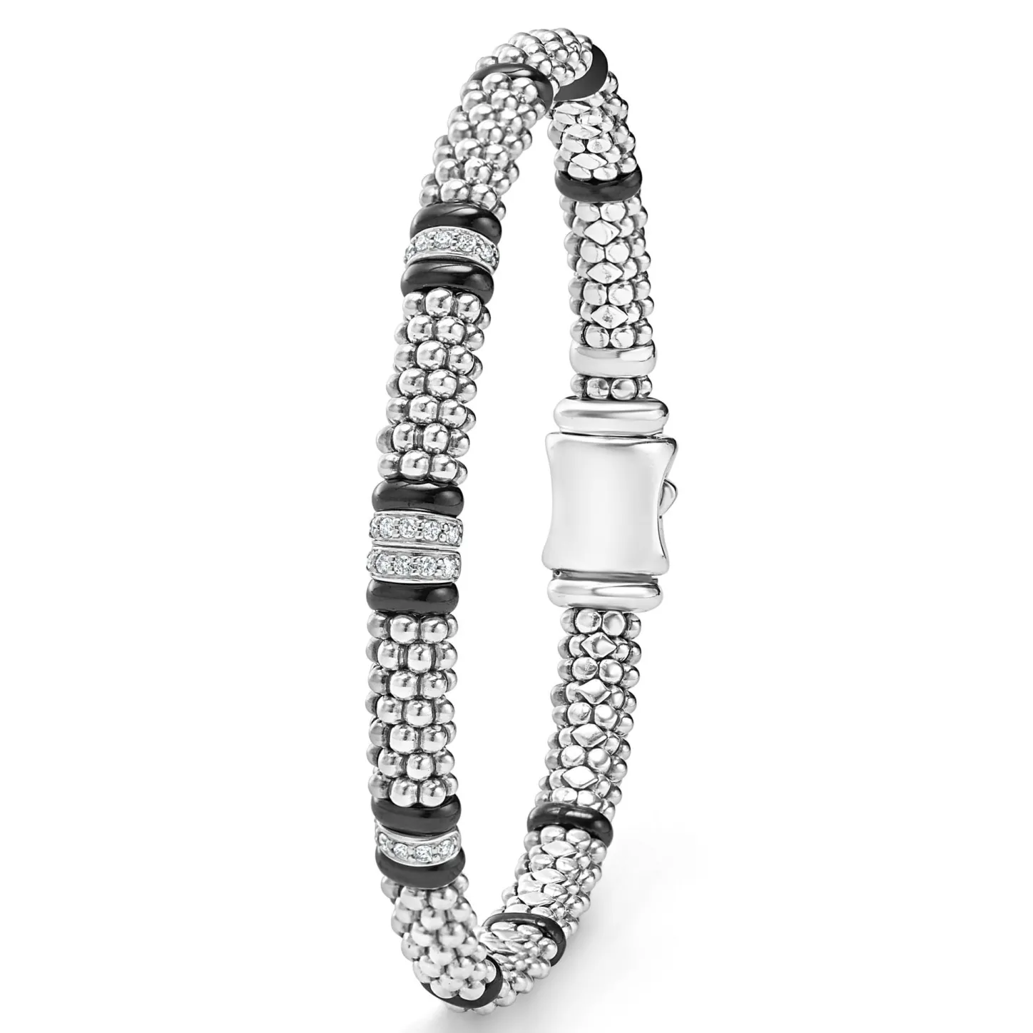 Four Diamond Station Set In Sterling Silver Surrounded By Black Ceramic And Caviar Beading. Lagos Diamonds Are The Highest Quality Natural Stones.