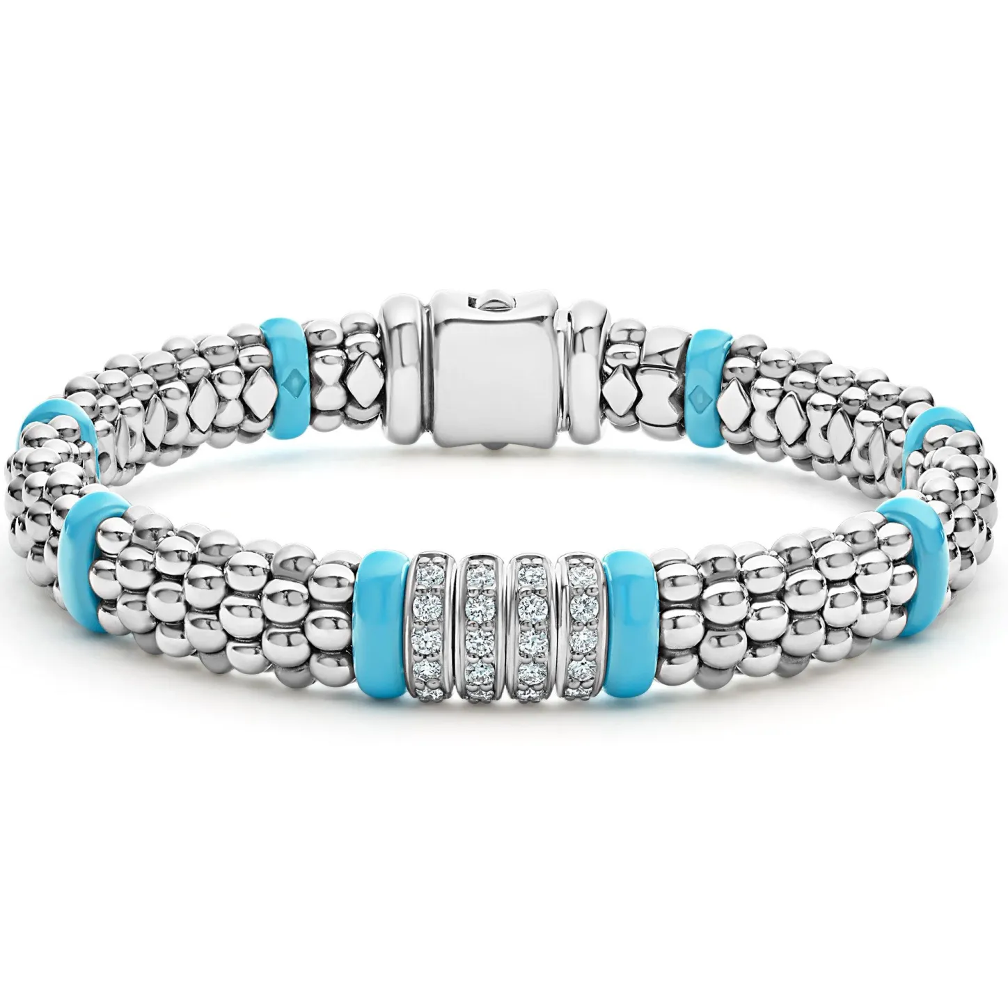 Four Diamond Stations Set In Sterling Silver Surrounded By Blue Ceramic Caviar Beading. Lagos Diamonds Are The Highest Quality Natural Stones.